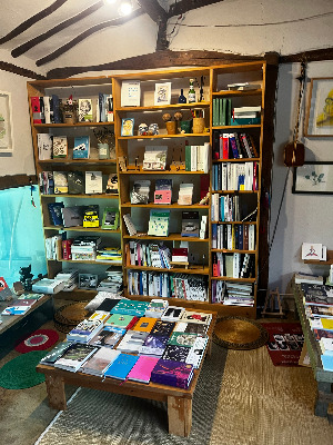 대문을 들어섰지만 인기척이 없어 잠시 망설이다, 출발 전 연락드렸던 전화번호로 다시 전화를 걸었습니다. "네, 안에 있습니다! 들어오세요!"라는 정겨운 목소리와 함께 문 열리는 소리가 들려왔죠. 그 목소리가 얼마나 반가웠는지 모릅니다. 방 오른쪽 문을 열고 들어가자, 마치 숨겨진 보물창고처럼 책들이 옹기종기 모여 있는 따뜻한 공간이 펼쳐졌습니다. 마루 한쪽에도 책들이 소박하게 쌓여 있었고, 그 오른쪽에는 계산대가 눈에 들어왔죠. 왼쪽 건넌방으로 향하니, 그곳이 바로 책방의 심장이자 영혼이 머무는 공간인 듯했습니다. 책장에는 책들이 제법 질서 정연하게 자리를 잡고 있었고, 저는 벽면부터 꼼꼼히 훑어보았습니다. 책이 아주 많지는 않았지만 새 책들이 주를 이루었고, 중간중간 헌책들도 조화롭게 섞여 있어 더욱 풍성한 이야기가 담겨 있는 듯했습니다.