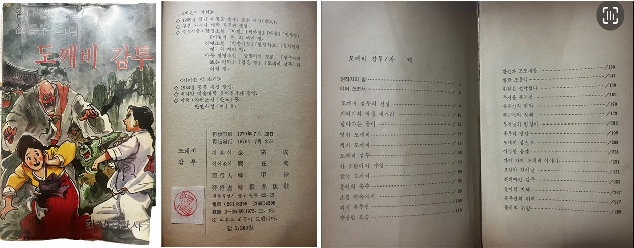 안타까운 것은 저자 서문에 이어 '이어쓰면서' 에 보이는 염재만 선생의 서문을 보면, 김내성 선생님이 당시 유명한 학생잡지 「학원」에 1956년부터 1957년 봄까지 10회를 연재하시다 완성하지 못하시고 돌아가셨다는 것입니다. 이 책 <도깨비 감투>는 1979년 7월 20일 재판(再版)으로 간행된 재판본으로 한진출판사에서 출판되었고 한국 최초의 장편 만화영화 <홍길동>으로 유명한 신동우 화백의 삽화까지 곁들여져 동화책의 가치를 더욱 높여주었습니다.