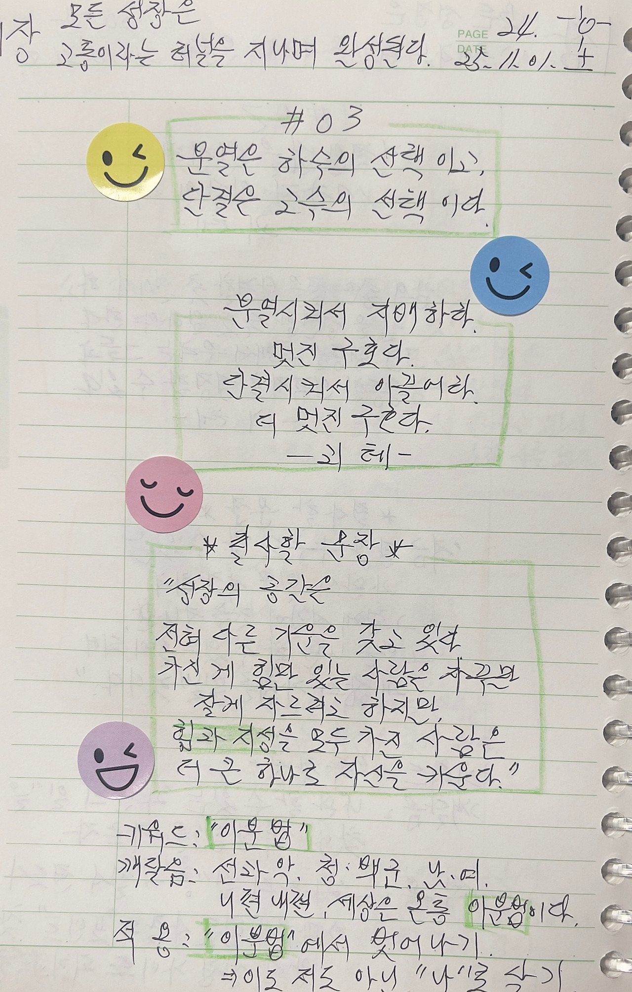 이 문장을 필사하며 나는 한참을 멈춰 섰다. 요즘 같은 시대에 이보다 더 절실한 말이 또 있을까. 우리는 참으로 좋은 시대를 살고 있다. 배우고 싶으면 나이가 들어서도 만학도가 되어 대학 강의실에 앉을 수 있고, 평생학습관에서 새로운 지식을 쌓을 수 있다. "이제 우리는 더 함께할 수 없습니다!", "생각이 다르니 공존할 수 없네요!", "그냥 우리끼리 가자, 말이 안 통하네!" 같은 말들이 난무하는 곳에서, 나는 이런 소리가 가득하다고 느꼈다.