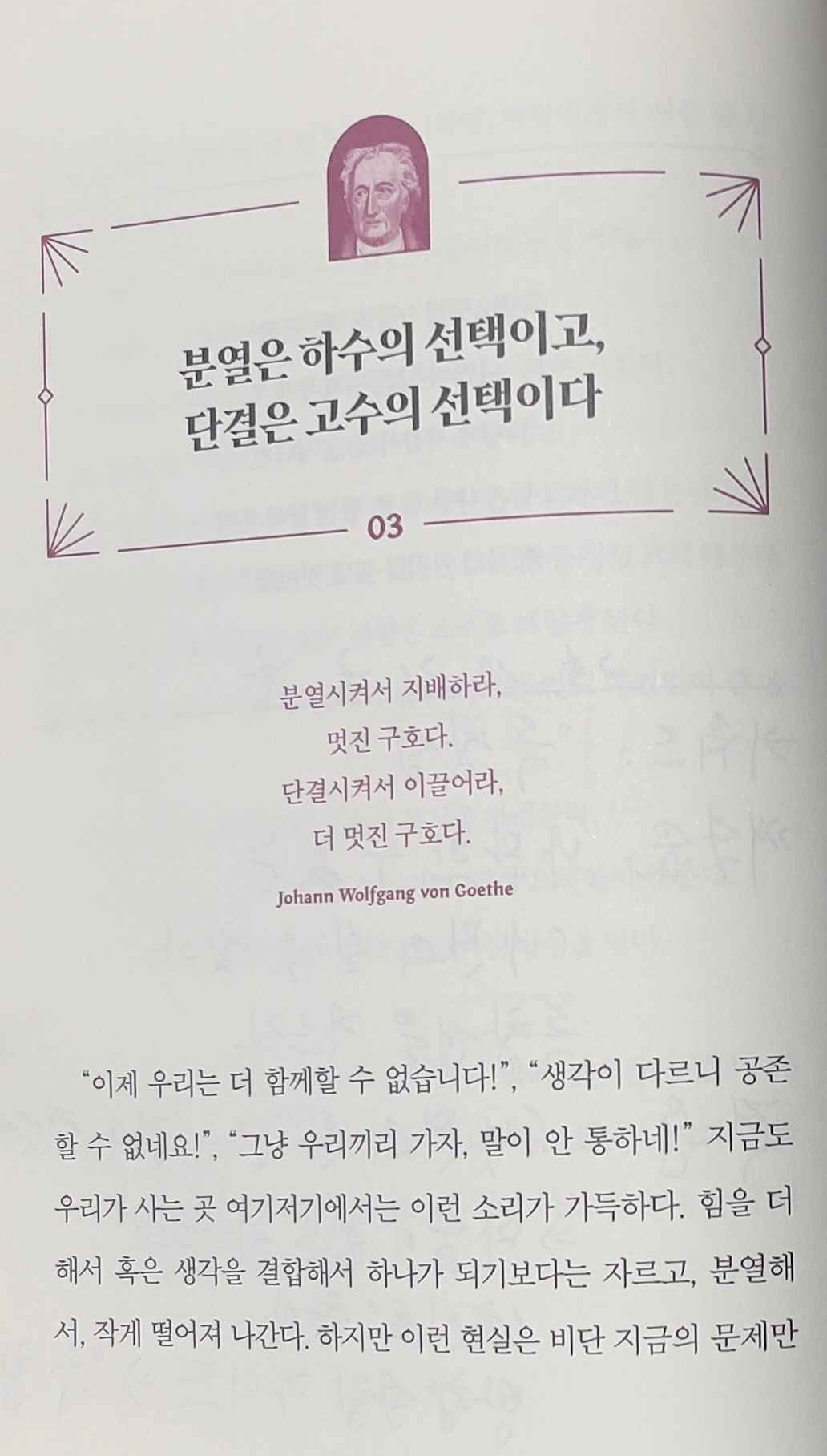 괴테가 말한 '단결시켜서 이끌어라'는 구호는, 어쩌면 누구와 단결할 것인가를 먼저 선택하라는 의미가 아닐까. 무조건적인 포용이 아니라, 함께 나아갈 수 있는 사람들과의 진정한 연대. 그것이 내가 찾아야 할 길이라는 걸, 이번 경험을 통해 깨달았다. 나는 여전히 단결을 믿는다. 다만 이제는 안다. 모든 사람과의 단결이 아니라, 진정으로 함께 걸어갈 수 있는 사람들과의 단결을 추구해야 한다는 것을. 그리고 그 길을 찾기 위해, 나는 때로는 용기 있게 빠져나올 줄도 알아야 한다는 것