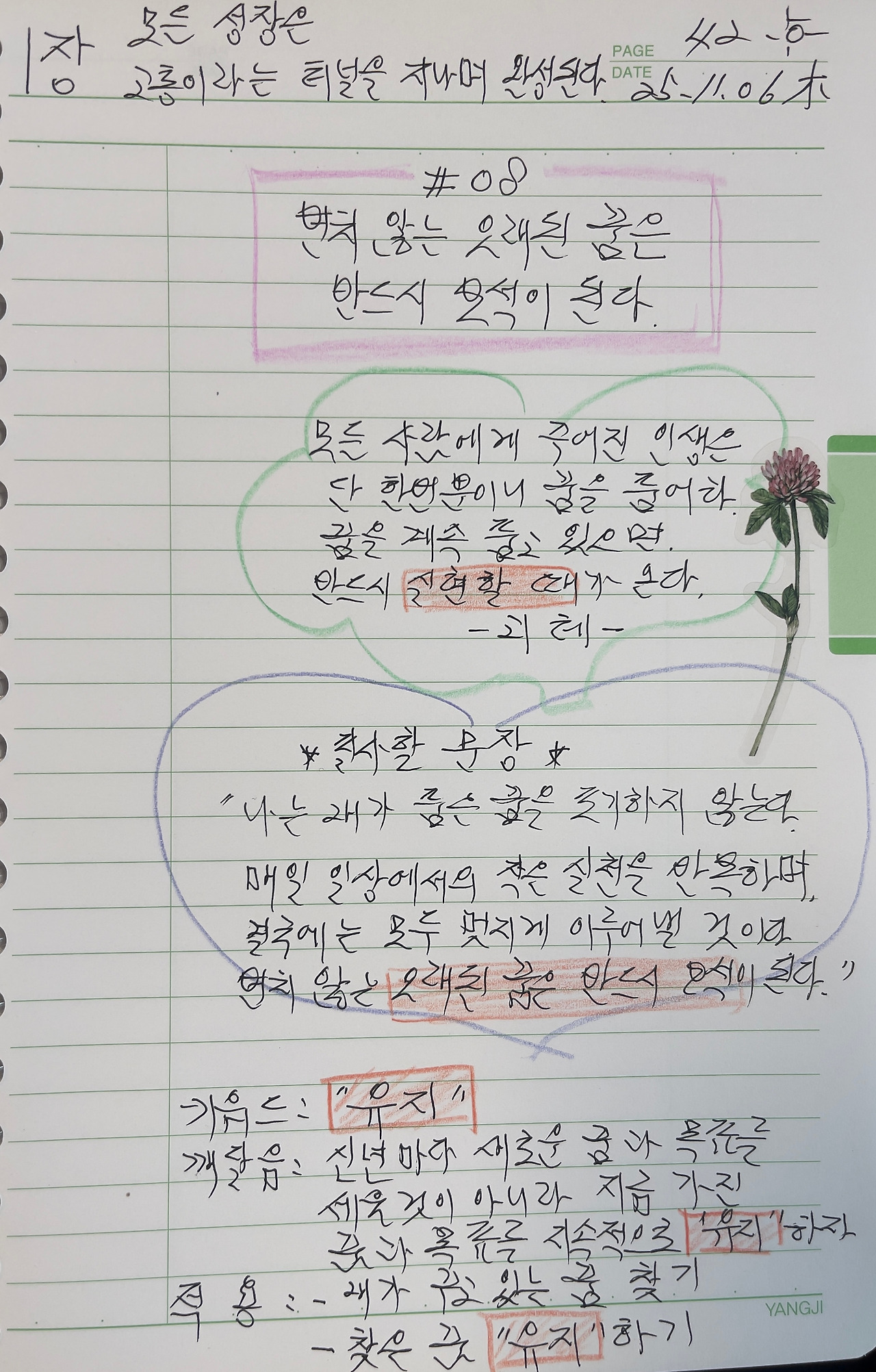 그리고 필사하면서 깨달은 것들을 글로 쓴다. 기록으로 남긴다. 이게 내 꿈이다. 26년에도, 27년에도, 아마 그 이후에도. 이번엔 바뀌지 않을 것 같다. 358일을 견딘 거북이의 감이다.