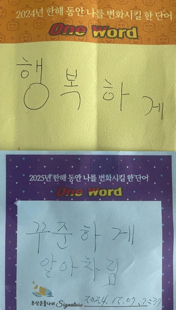 독서모임에서는 해마다 '원워드'라는 걸 쓴다. 새해 목표를 한 단어로 압축하는 것인데, 작년 내 원워드는 '행복하게'였고, 올해는 '꾸준하게'와 '알아차림'이었다.