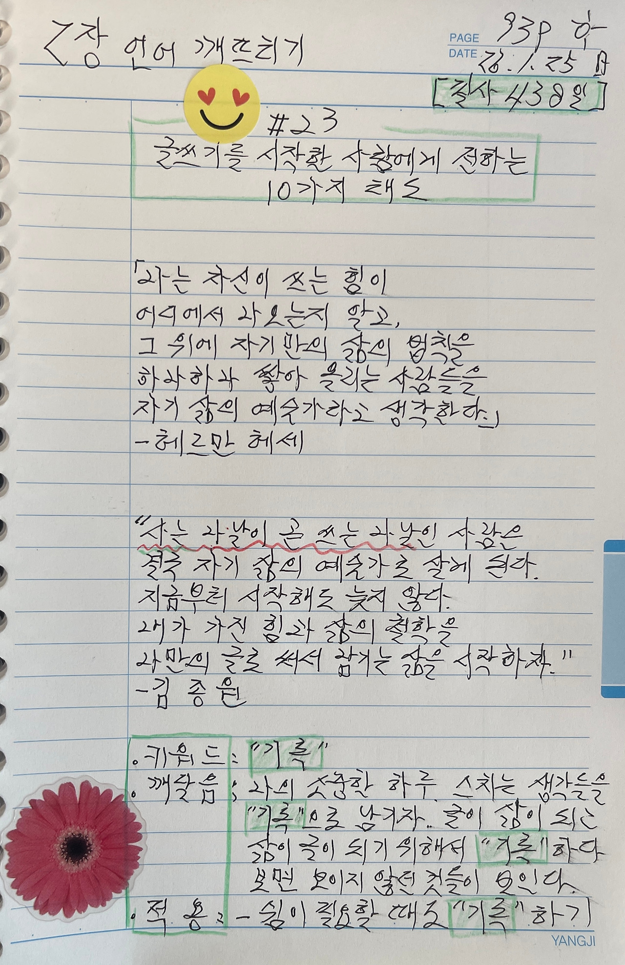 누군가에게는 그토록 간절했던 '오늘'이 나에게 도착했습니다. 스치는 생각들을 방치하면 하루는 그저 흘러가 버리지만, 그것을 붙잡아 종이 위에 옮기면 하루는 '기록'이 되고 기록은 마침내 '삶'이 됩니다. 기록은 나를 지키는 가장 선명하고도 영원한 흔적입니다.