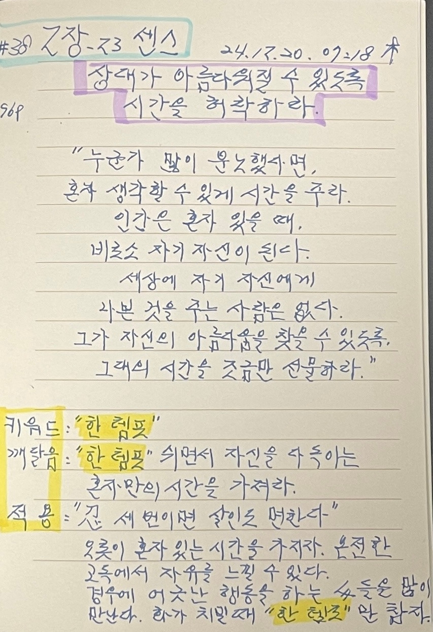 때론 정말 화가 나는 문자나 카톡이 날아올 때가 있다. 그 즉시 답장하면 감정이 날것으로 드러날 뿐이다. 김종원 작가는 말한다. “상대가 감정을 다스릴 시간을 5분 주어라.” 그러면 상대가 카톡을 지우고 다시 보낼지도 모른다고. 하지만 내겐 그 5분이 스스로 감정을 다스리는 시간이다. 화난 상태로 쓴 답장은 결국 후회를 남기기 마련. 5분 동안 산책하며 마음을 다독인 후 답장을 보내면 내 감정도, 상대의 마음도 다칠 일 없다.