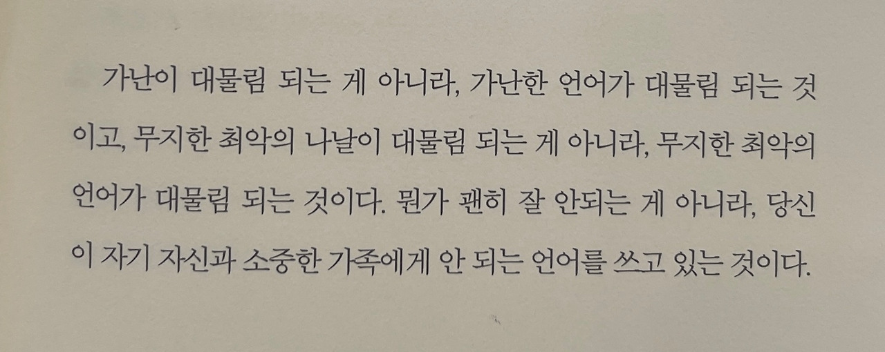 가난이 대물림되는 게 아니라, 가난한 언어가 대물림되는 것이라는 말에 온몸에 소름이 돋았다. 과연 나는 내 자녀들에게 어떤 언어를 쓰고 있는지 돌아보게 된다. 가난을 대물림해 주고 싶은 부모는 없다. 그렇다면 가난한 언어 대신 부자의 언어를 대물림해줘야 한다. 욕을 할 때도 "야, 이 대성할 놈아"