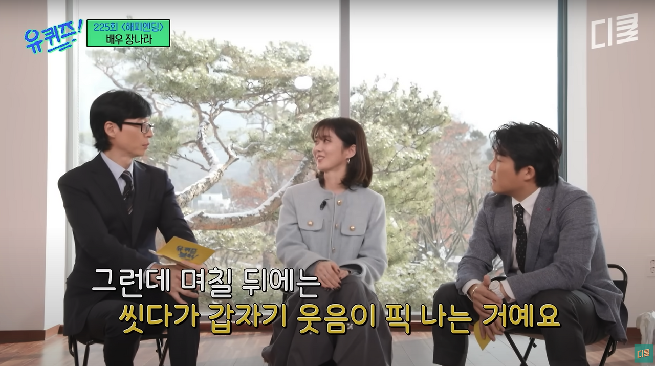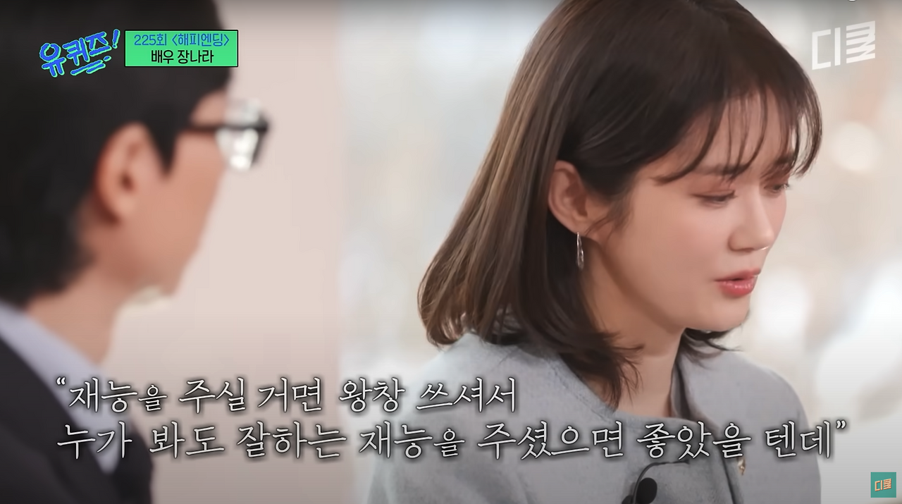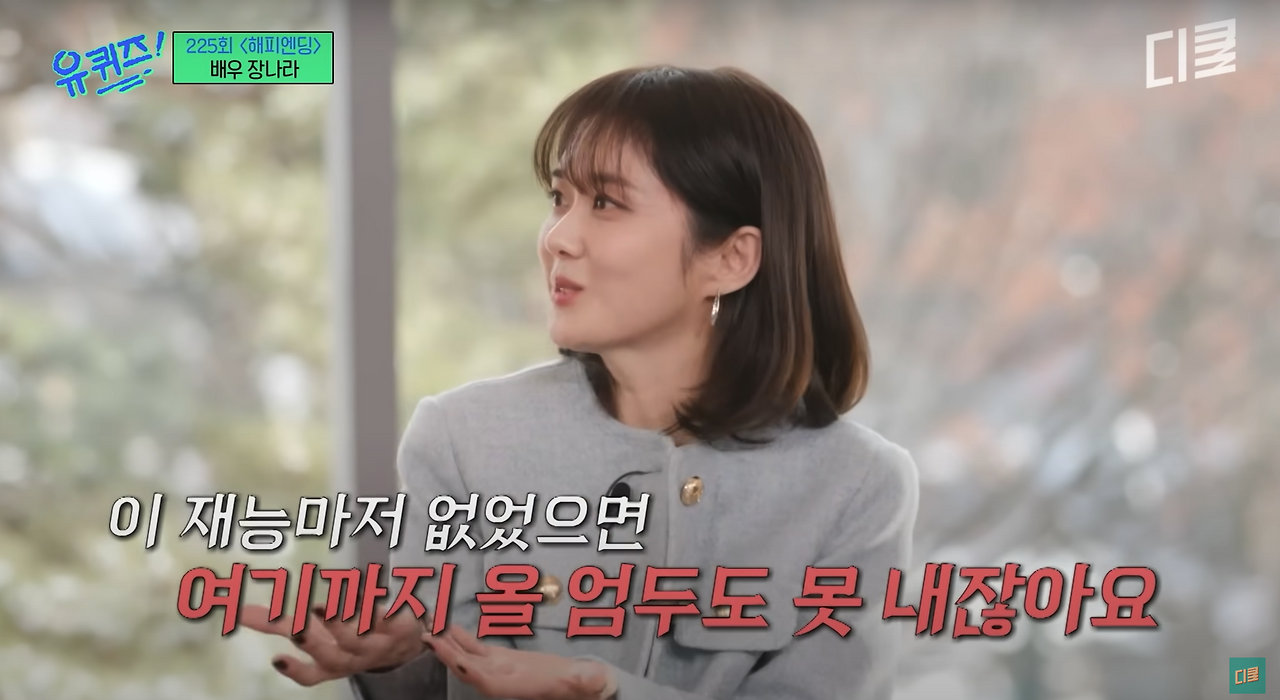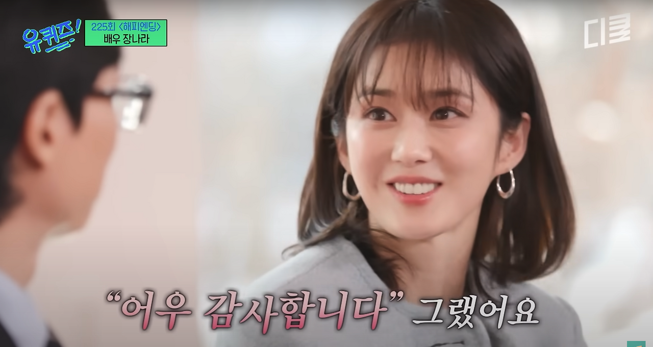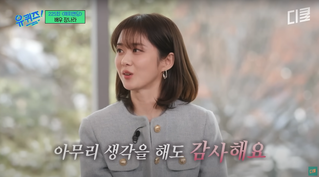 어릴 때 가수 장나라 언니(혼자만의 친밀감에 언니라 부른다.)를 너무나 좋아했었다. '축전', '펜띠' 모두 장나라 언니로 도배되었고, 내 '벅스뮤직' 플레이리스트에는 언니의 노래로 가득했다. 이제는 가수가 아닌 연기자로서의 입지를 탄탄하게 쌓아나가는 언니를 보며 늘 내적 응원을 보내고 있었는데 최근 '유퀴즈'에 출연했단 소식에 유튜브로 찾아봤다. 프로그램 속 언니는 신혼의 삶을 마음껏 즐기는 모습이었고, 너무나도 안정된 모습을 보면서 참 멋있는 사람이라는 생각까지 들었는데, 그중에서 한 장면이 내 뇌리에 박혔다.