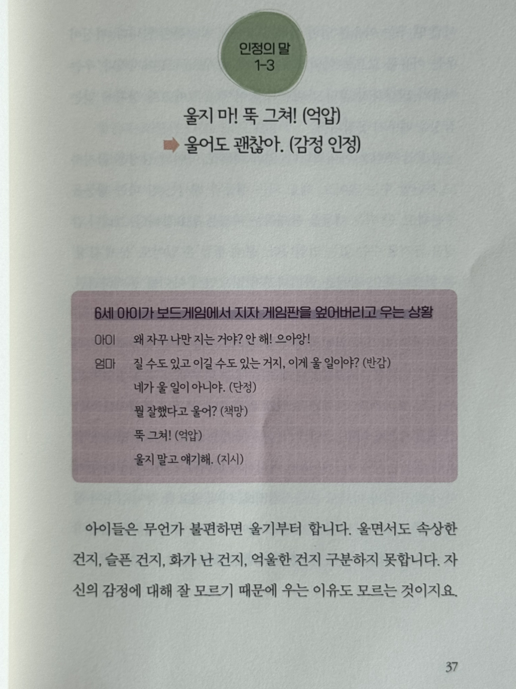 감정은 친절하게 수용하 돼, 행동엔 엄격해져야 한다. 우는 건 괜찮지만, 원하는 걸 얻기 위해 떼를 쓰거나 분풀이하는 건 괜찮지 않다.