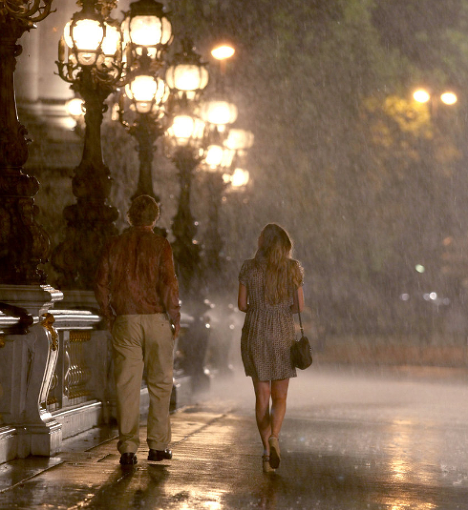 이 영화의 엔딩 장면에서 이상이 맞지 않던 약혼자 이네즈와 헤어지고 자신이 사랑하는 파리에 남기로 한 길 펜더는 그날 밤 세느강변 다리에서 우연히 예전에 들렀던 노스탤지어 샵의 점원 아가씨 가브리엘을 만나는데, 샵 주인이 콜 포터의 판을 새로 구해 와서 그쪽 생각이 났다는 말에 자신이 콜 포터의 팬인걸 기억해주는 가브리엘에게 크게 호감을 갖게 되고 집까지 바래다주겠다고 말한다. 마침 비가 내리기 시작했으나 전혀 개의치 않고 오히려 비 오는 파리가 가장 예쁘다는 가브리엘을 기쁘게 반기며 유유히 함께 비 속을 걸어가는 뒷모습에서 두 사람의 운명 같은 인연의 복선이 깔린다.