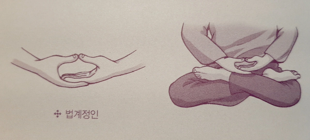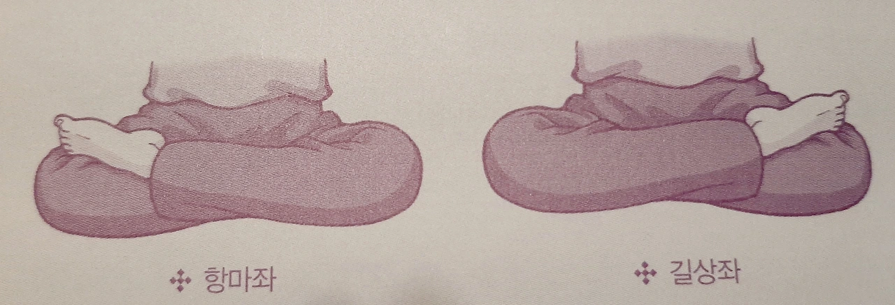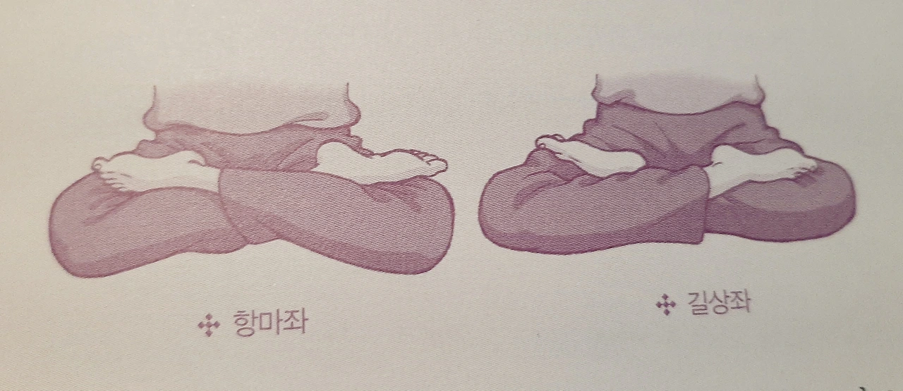 다음은 가부좌를 트는 방법이다. 양 발을 두 허벅지 위에 올리고 앉는 결가부좌와 한쪽 다리만 올리는 반가부좌가 있다. 결가부좌는 초보자에게 쉽지 않을 수 있으니 처음엔 반가부좌로 시작해서 익숙해지면 결가부좌를 자연스럽게 할 수 있게 된다. 반가부좌 할 때 방향은 상관없이 편한 쪽 다리를 올리면 된다.