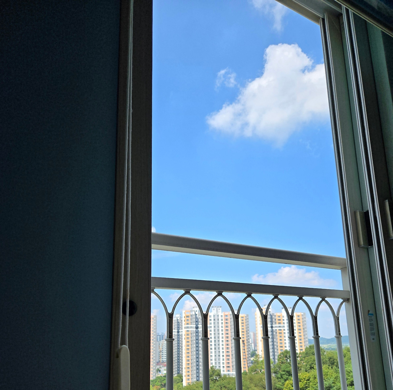 아들 침대에 기대어 바라보는 창밖 아침풍경이다.