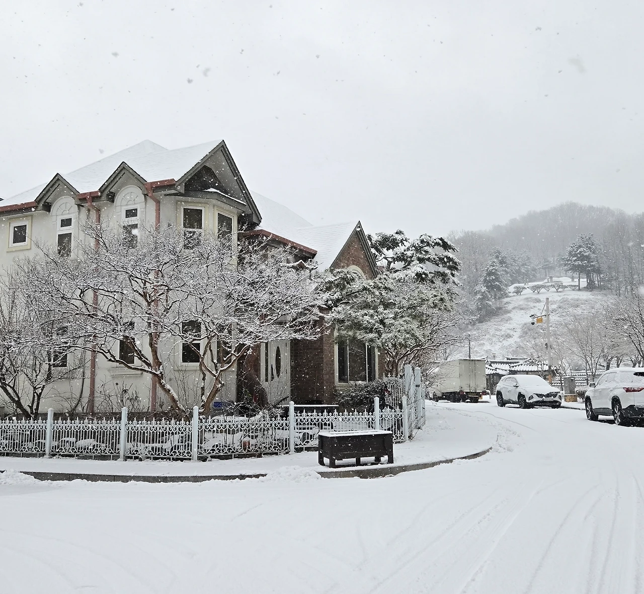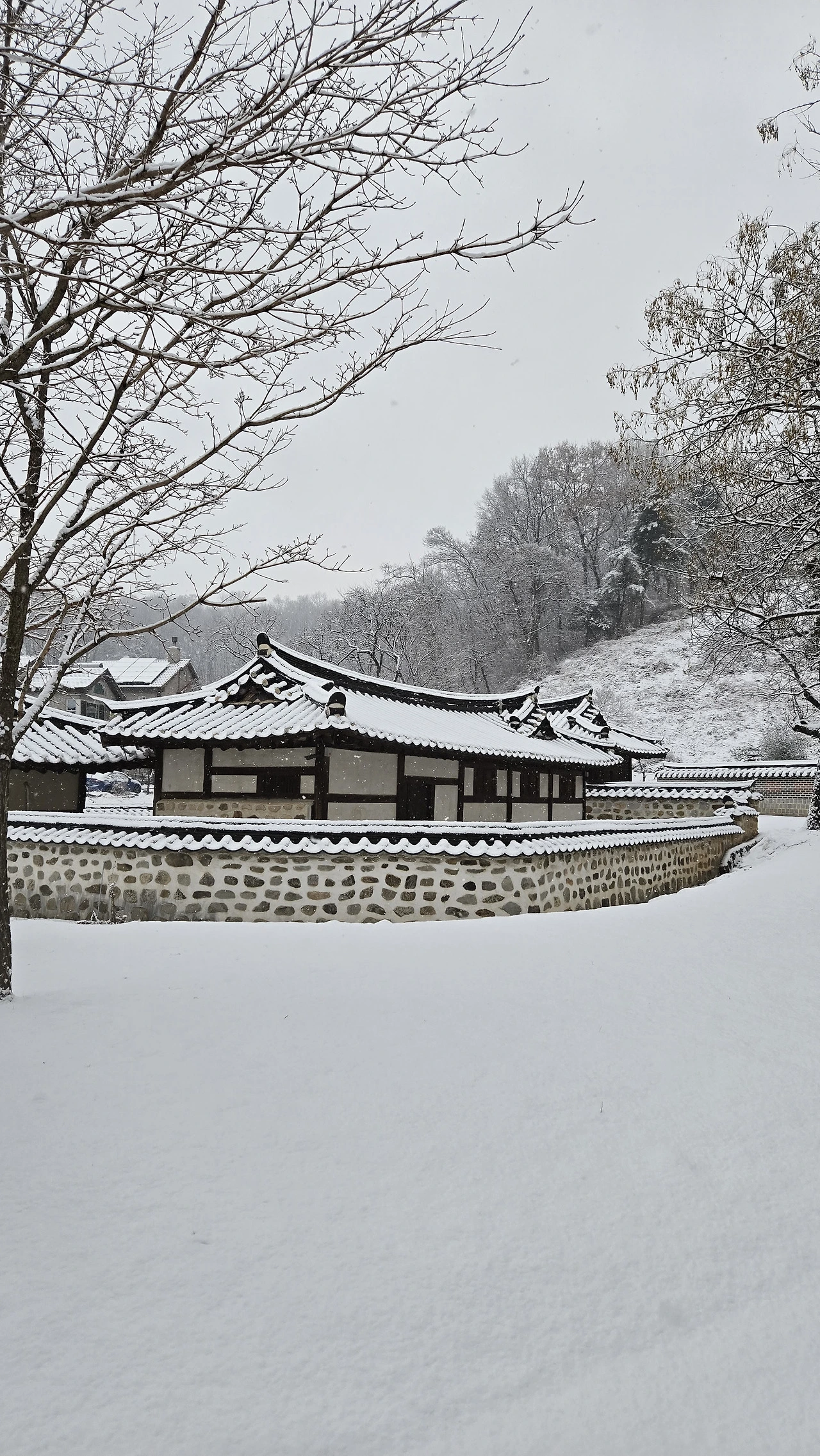 사진은 눈 내린 날 영모제 고택 모습이에요. 흰 눈이 덮인 한옥의 미가 돋보이죠?