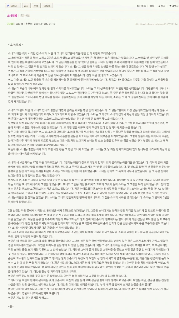 < 소녀의 城 >은 2001년에 대학 동아리 카페에 올렸던 글이다. 오랜 세월 서랍 속에 넣어둔 글을 꺼내어 읽노라니 오래된 책에서 느껴지는 곰팡내가 풍기는듯하다. 세월은 흐르고 흘러 오늘에 이르고, 이 오늘도 또 세월 저편으로 흘러가게 되겠지..