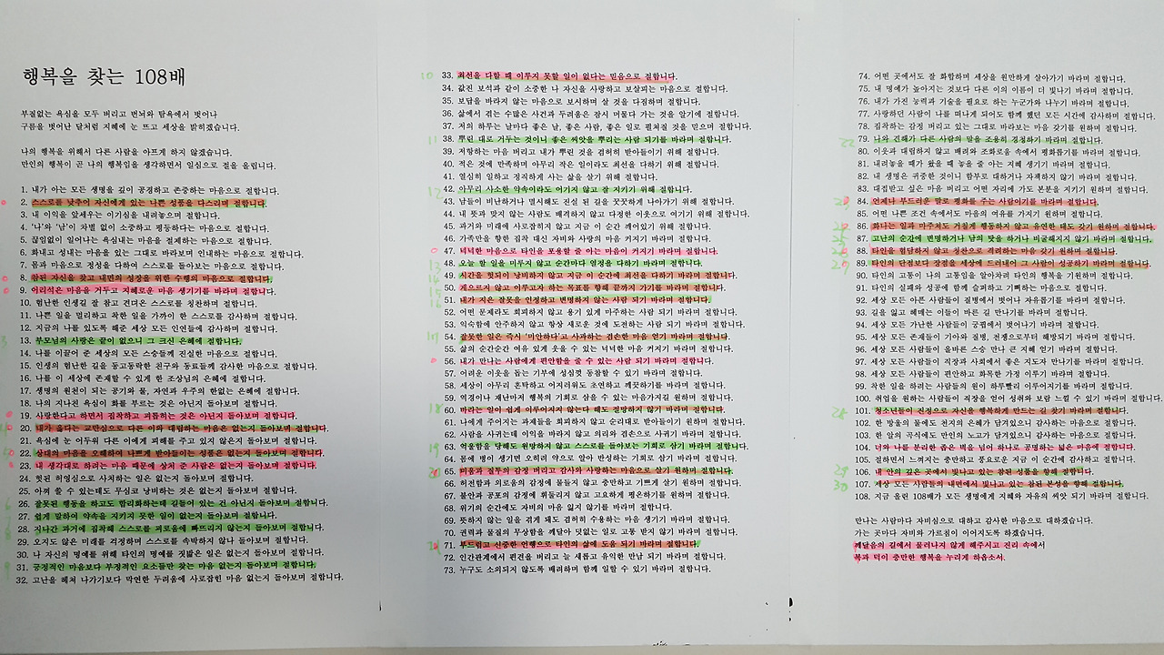 <행복을 찾는 108배> 초록줄은 아들에게, 핑크줄은 내게 좀 더 필요한 수행문이다. 거실벽 한켠에 붙여놓고 해당되는 잘못을 했을 때마다 서로 읽어주며 환기 시킨다.ㅎ