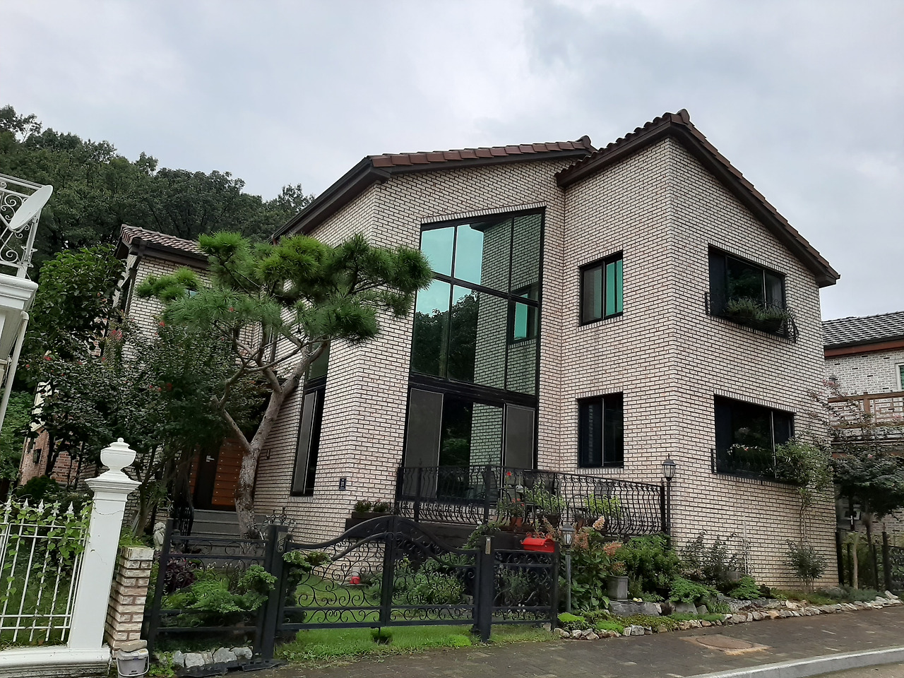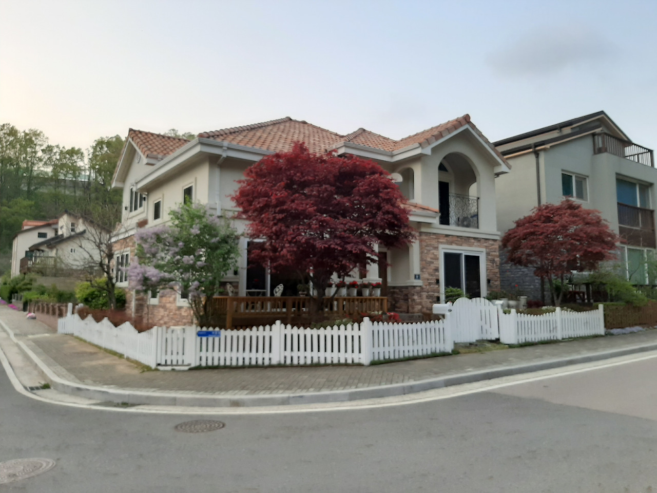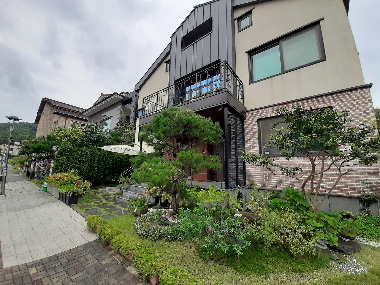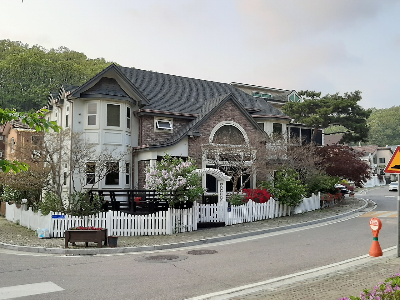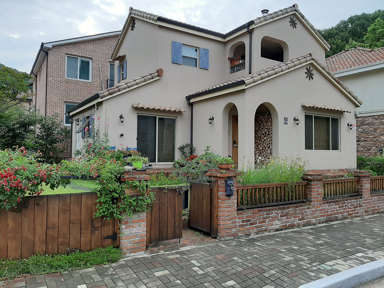 전원주택단지. 각각의 취향대로 지어진 집들과 작지만 정갈한 정원의 모습이 즐겁다