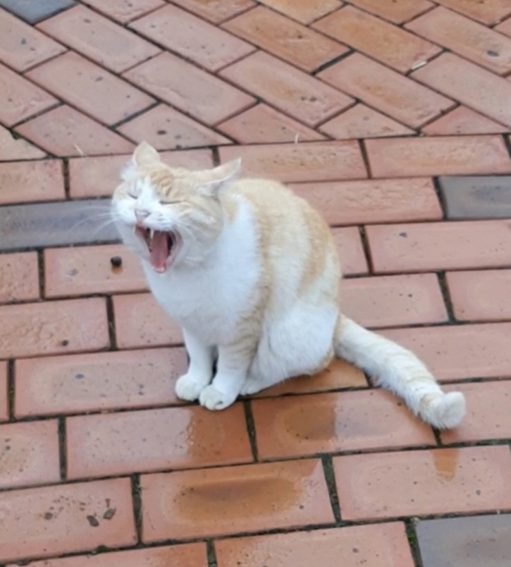 비내리는 한적한 공원 한가운데서 기지개펴고 하품하는 야옹이