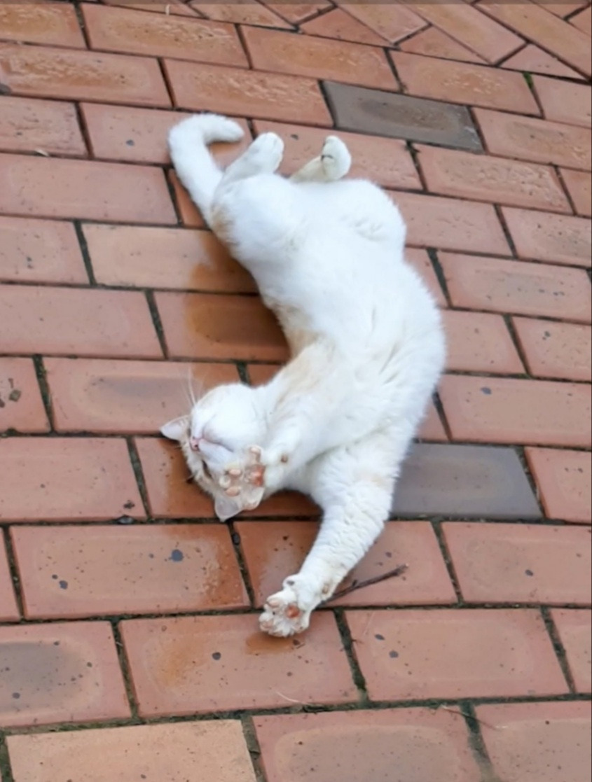 한 공원을 지날 때 차밍한 자세로 앉아 있는 고양이가 너무 예뻐 눈길을 빼앗긴 적이 있었는데, 이슬비에 촉촉하던 어느 날 그 고양이를 다시 만났다. 젖은 공원 한가운데에 똑같은 자세로 다소곳이 앉아 있었다. 두 번째 만난 인연으로 다가가 인사를 전하는데 놀랍게도 전혀 경계를 하지 않았다. 오히려 내가 말을 걸며 다가가자 야옹 대답하며 하얀 배를 뒤집어 보여주며 축축한 바닥에 들어 누웠다. 길냥이들을 만져본 적이 없어서 조금 어색하게 쓰다듬으며 한동안 대화를 나눴다.