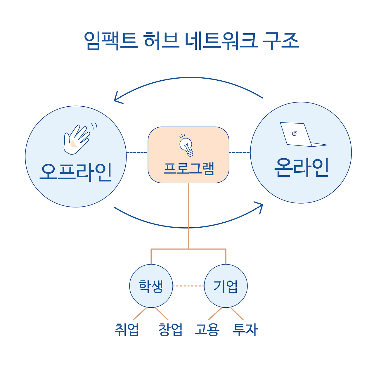 1. 온라인: 멤버를 구성하고, 관리하는 시스템이다. 기업, 학생, 구직자 등이 자신에게 맞는 프로그램을 찾아서 신청할 수 있는 창구다. 멤버가 되면 임팩트 허브 내에 사무실 자리를 문의를 할 수 있고, 이벤트에 참여할 수 있으며, 스타트업에서 여는 각종 서비스에 참여할 수 있다. (스타트업 기업가들의 모임, 예비 창업가들을 위한 각종 트레이닝 코스, 첨단 기술을 연구하는 인큐베이팅 프로그램 등 참여 가능하다.) 물론, 온라인에서만 진행되는 이벤트도 있지만 대부분 오프라인 미팅으로 연결된다.