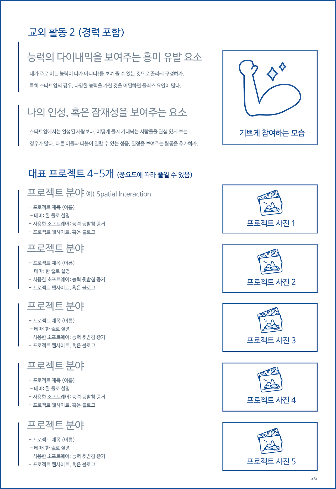 2. 두 번째 페이지 키워드: 교외 활동(경력 포함), 프로젝트 미니 포트폴리오.