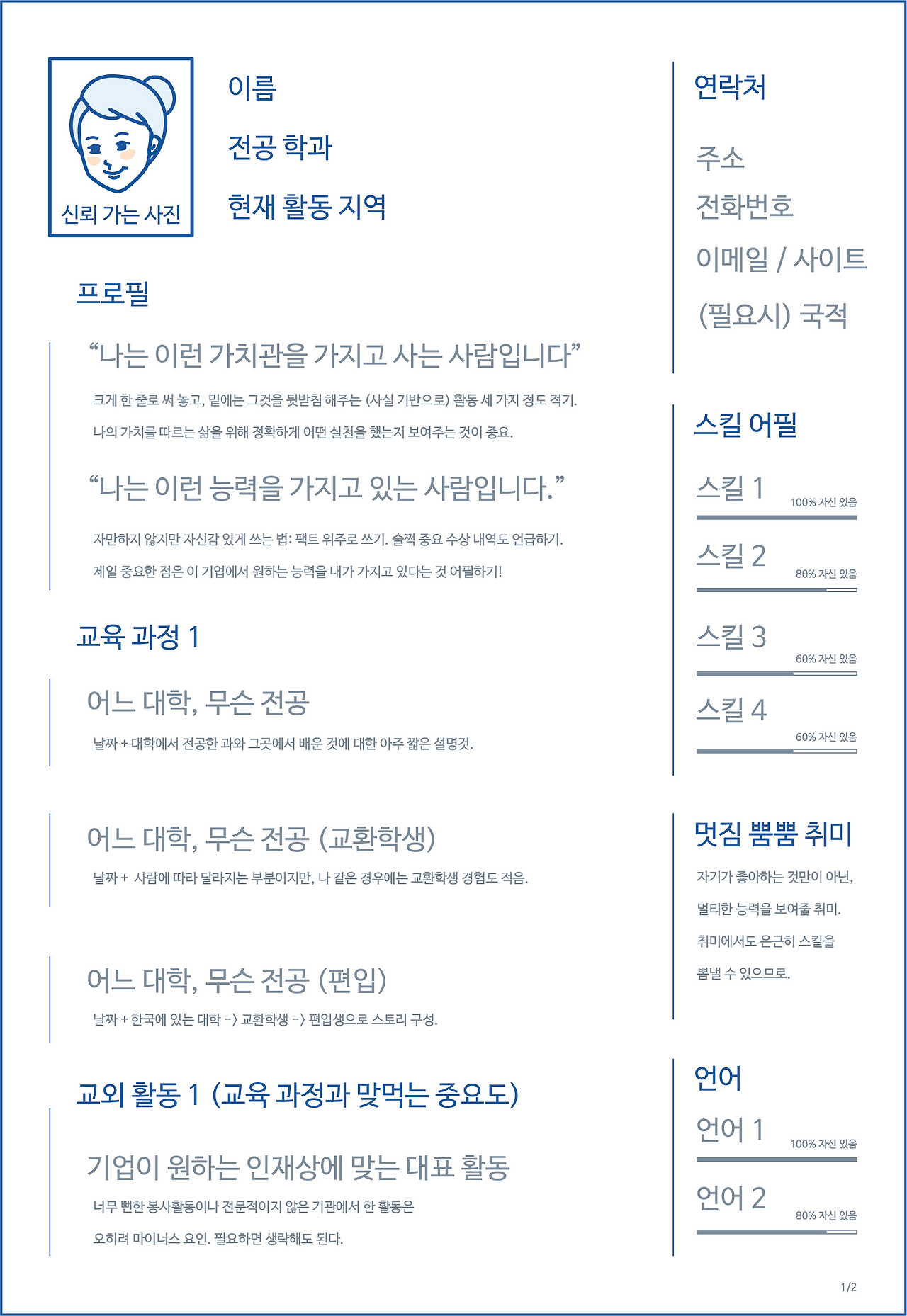 1. 첫 페이지 키워드: 사진, 이름, 신상, 프로필, 교육, 교외 활동, 능력, 취미, 언어.