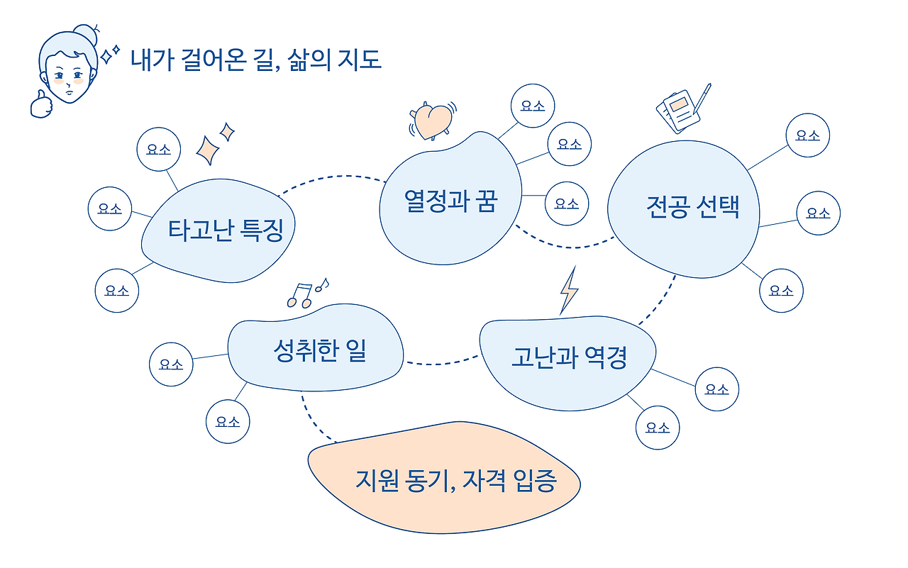 일단 면접을 보러 갔다고 상상해 보자. 가장 처음 이야기할 부분이 자기소개다. 첫마디를 평범하게 ‘저는요….’이렇게 시작할 수는 없다. 스위스에서는 보기 드문 ‘이주영’이라는 이름만큼, 대표님에게 스스로를 각인시킬 강력한 한 방이 필요하다. 나는 작가이자 일러스트레이터, 디자이너인 나만의 특장점을 살려서 내 삶을 시각적으로 보여주기로 했다. 그 방법은 ‘내 삶의 지도’를 준비해 가는 것이었다. 우선 내 가치관, 지금껏 걸어온 길 등을 한 장의 A3 종이 한 장에 담았다. 그리고 그 지도를 보여주면서 스토리텔링 할 부분과 키워드를 2-3분 내로 연습했다. 아래는 그 지도의 구성을 그림으로 옮긴 것이다.