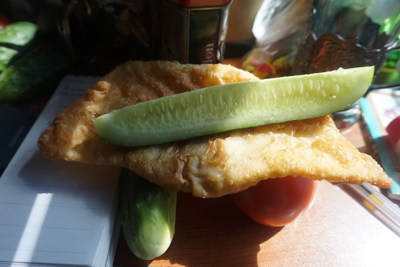 ‘체보렉’이라는 빵을 먹었다. 납작 만두와 같은 맛이 나 맛있게 먹었다. 이 체보렉이라는 빵과 토마토 그리고 오이는 찰떡궁합이다. 그새 러시아 사람이 다 된 느낌이다. 또다시 이 야채를 소금에 먹고 있는 이들에게 내가 고추장을 꺼내 조금 뿌려줬더니 사람들의 얼굴이 금세 빨개지며 물을 찾는다. 그 모습이 참 재밌다.