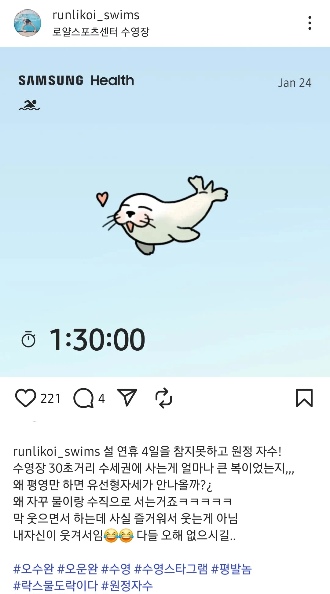 자유수영 한 타임 가격이 내가 다니던 구립 수영장의 1.5배임에도 불구하고, 연휴에 운영하는 수영장이 별로 없다 보니 온 세상 수영인들이 다 모인 것처럼 바글바글했다. 나는 괜히 누구에게 질세라 1시간 30분을 꽉꽉 채워 열심히 연습했다.