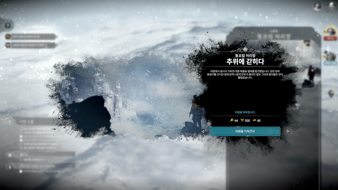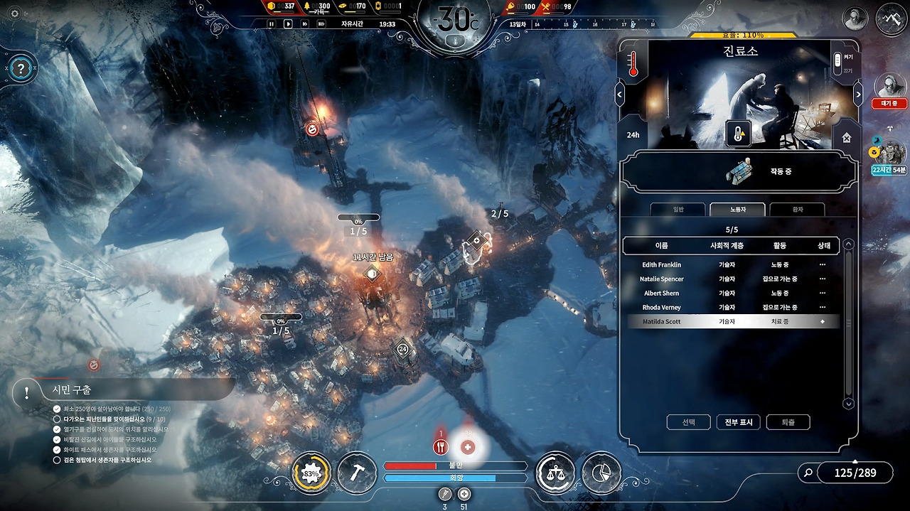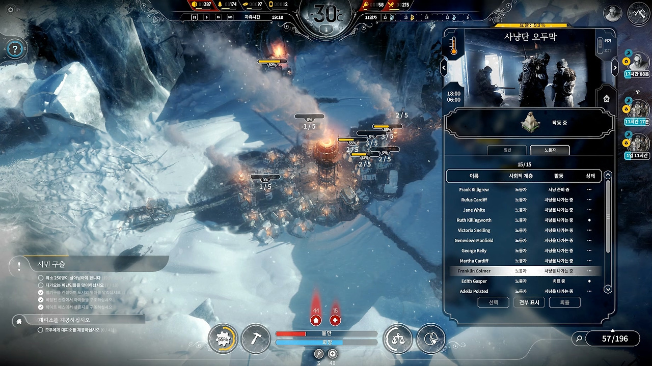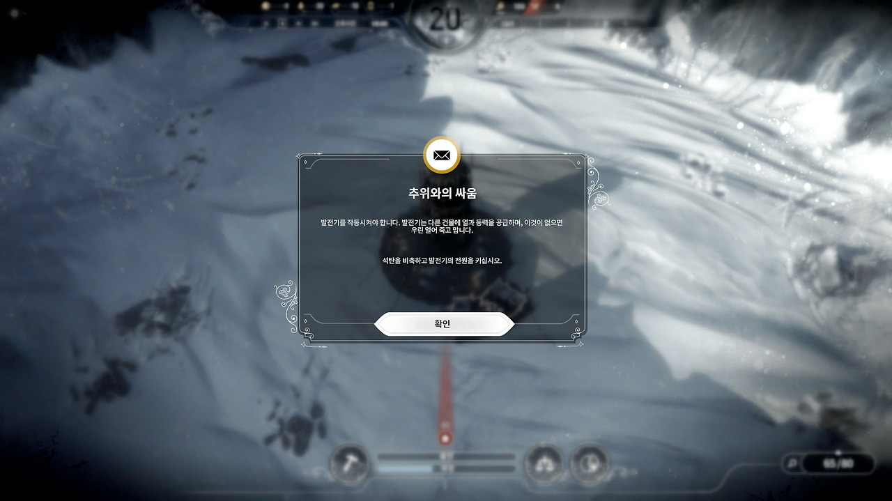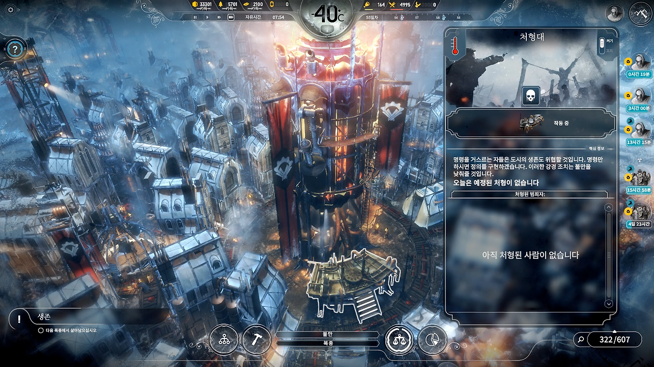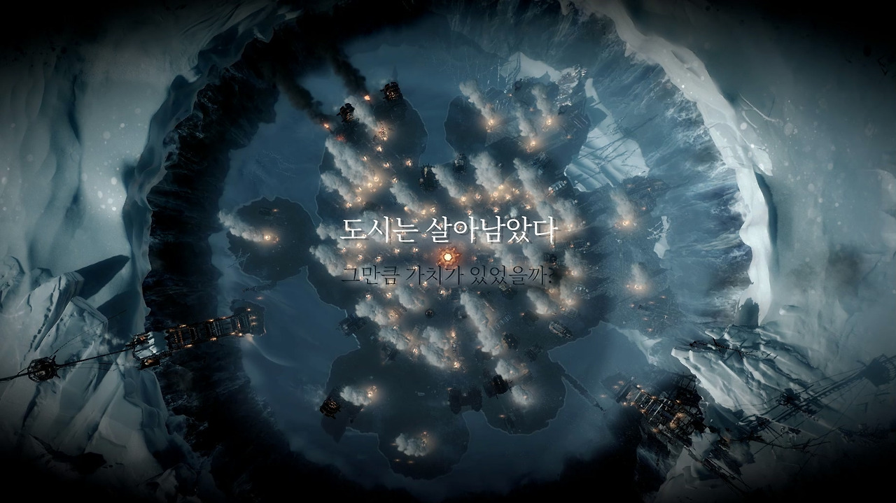 [프펑]에서 유저는 시민과 함께 원인 모를 빙하기를 극복하기 위해 수많은 선택의 갈림길에 서게 됩니다. 아동에게 위험한 일을 시켜서 노동력을 얻을지, 톱밥을 섞어서 식량을 늘릴지, 매춘업을 들여서 불만을 잠재울지 등을 말입니다. -20˚ ~ -50˚가 기본인 세계이기 때문에 생존을 위한 정책을 만들 때마다 양심과 효율을 저울질하게 됩니다. 그렇다고 눈 딱 감고 효율만 챙기면 시민의 불행이나 희망 수치가 극적으로 바뀌어 마을 밖으로 추방당합니다. 그래서 유저는 양심과 효율 사이에서 끊임없이 갈등하고, 시민들의 불평과 사망 소식에 괴로워합니다. 결과물이 이에 잘 보답해주는 것도 아닙니다. 첫 번째 시나리오에 엔딩이 4가지 있는데, 그중 3가지가 부정적인 문구로 마무리됩니다. 마치 포스트 아포칼립스에서 희망을 찾는 것이 매우 어렵다는 듯 말입니다.