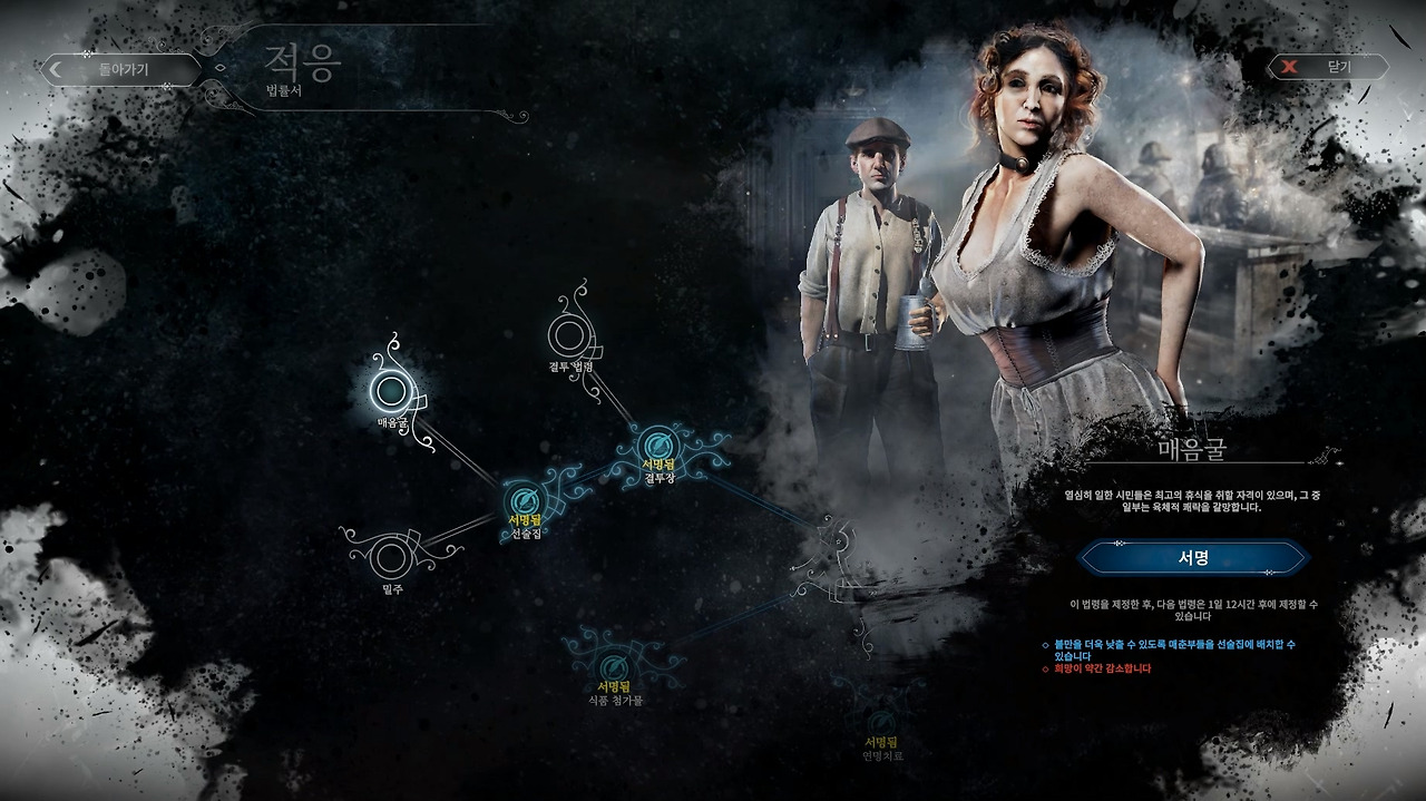 그래도 어찌어찌 진행하다 보면 자원 관리도 익숙해지고 시민 다루는 법도 어느정도 파악됩니다. [프펑]의 UI가 필요한 정보를 빠르고 명확하게 잘 줘서 입문자도 숙달되기 쉬운 편입니다. 하지만 그때 유저에게 큰 시련이 닥칩니다. 대략 첫 번째 시나리오 초중반 즈음인데, 모종의 사건이 일어나자 시민의 희망이 크게 감소하고 도시를 떠나려는 런던파가 생기는 것입니다. 일정 시간 내에 희망을 되살리지 못하면 유저는 도시에 쫓겨나고, 런던파는 도시 밖으로 나가게 됩니다. 이를 막기 위해 플레이어는 질서나 신앙 중 하나를 선택하여 시민의 믿음을 얻어야 합니다. 하지만 질서를 택하면 철권 통치로 지배하는 독재 체제로, 신앙을 선택하면 유저를 신으로 숭배받는 광신도 집단으로 도시가 변질하고 맙니다. 양심과 생존을 둘 다 챙기기 위해 역사 속에 묻어뒀던 방식까지 가져오는 것입니다. 유저에게 심적 갈등과 후회를 유발하기 위한 장치라고 생각되지만, 사실 실제 게임 플레이 측면에서 보면 그렇게 극단적인 상황으로 가는 경우는 난이도가 너무 높거나 초보적인 실수를 연발하지 않는 이상 거의 일어나지 않습니다. 개인적으로 필자는 지금까지 플레이로 전달했던 메시지의 힘이 가장 떨어지는 순간이라고 생각합니다. 애초에 독재나 광신도까지 도달하게 만드는 변수도 적은 편입니다. 가장 이상적인 건 유저의 상황이 어느 정도인지 측정하고 그만큼 알맞은 시련을 주는 동적 난이도 시스템을 추가하는 것입니다. 하지만 그건 개발하기 워낙 어렵고 까다로워서 현실적으론 힘든 작업입니다. 동적 난이도 없다고 비판하는 사람은 인간이 아닐 정도입니다.