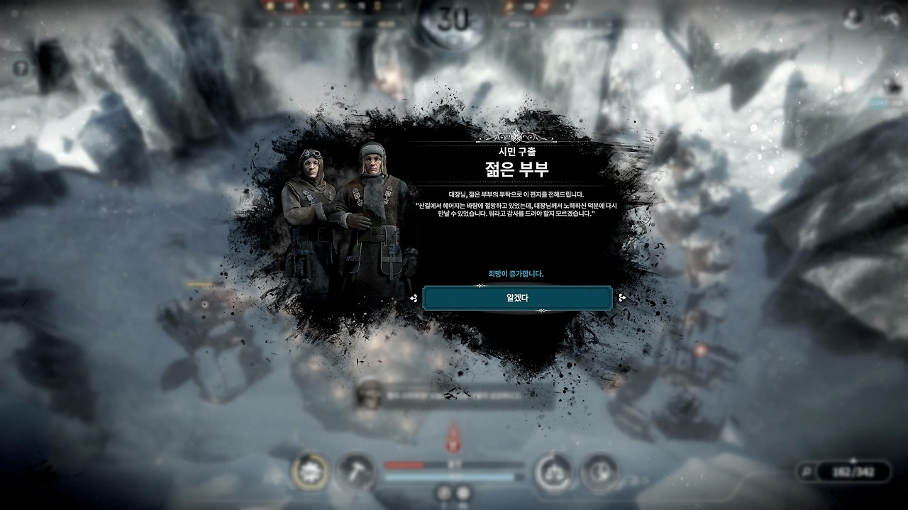 이때부터 [프펑]에 변수가 적다는 게 눈에 들어오기 시작합니다. 보통 유저는 경영 시뮬레이션 게임을 할 때 다양한 전략성을 실험할 수 있길 바랍니다. 하지만 [프펑]은 시나리오마다 다른 환경에서 시작하기 때문에 문제와 해결 방식이 명확한 편입니다. 그나마 탐험대 목적지가 랜덤하게 나와서 자원을 조금씩 다르게 얻지만, 그것도 난이도를 높여야만 변수로서 작동합니다. 예를 들어 피난민들 시나리오에서는 시민이 너무 많아서 탐험대가 통조림 통장을 찾아서 식량 500개를 얻지 못하면 굶주림을 해결하기 힘들어집니다. 이렇듯 [프펑]에 변수가 적게나마 존재하며, 개발자가 의도적으로 변칙성과 전략성을 줄였다는 추측이 가능합니다. 게임을 이렇게 만든 첫 번째 이유는 스트레스 극대화를 방지하기 위함일 것입니다. 유저에게 내적 갈등을 유발하기위해 [프펑]의 진행은 빡빡하게 설계되어 있습니다. 고정적으로 발생하는 시련을 극복하기도 급급한데 추가 변수가 무작위로 등장하면 문제를 해결하기 정말 어려워집니다. 거기다 [프펑]의 메시지 전달력까지 생각했을 때 게임에 익숙해지기 전까지는 1회차도 다소 부담스러울 수 있습니다.