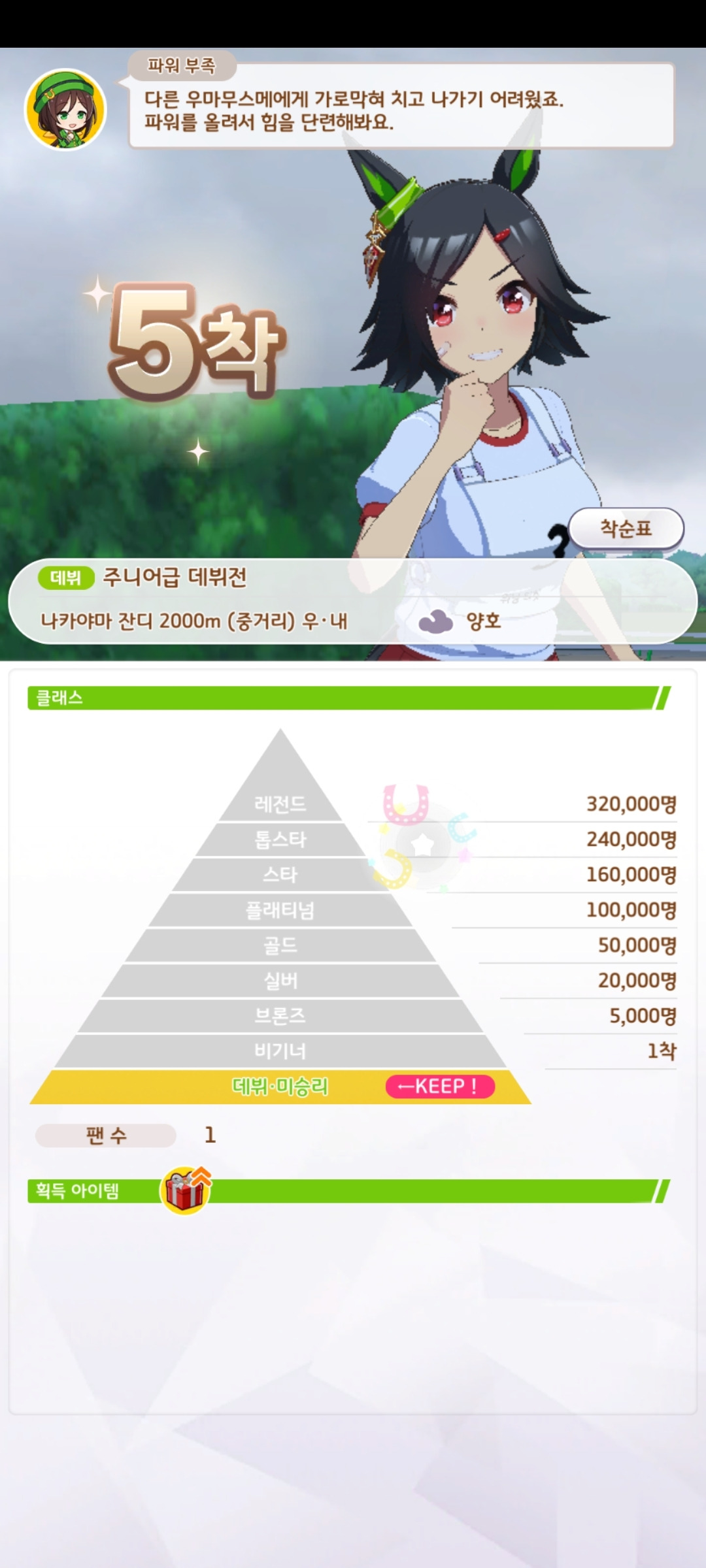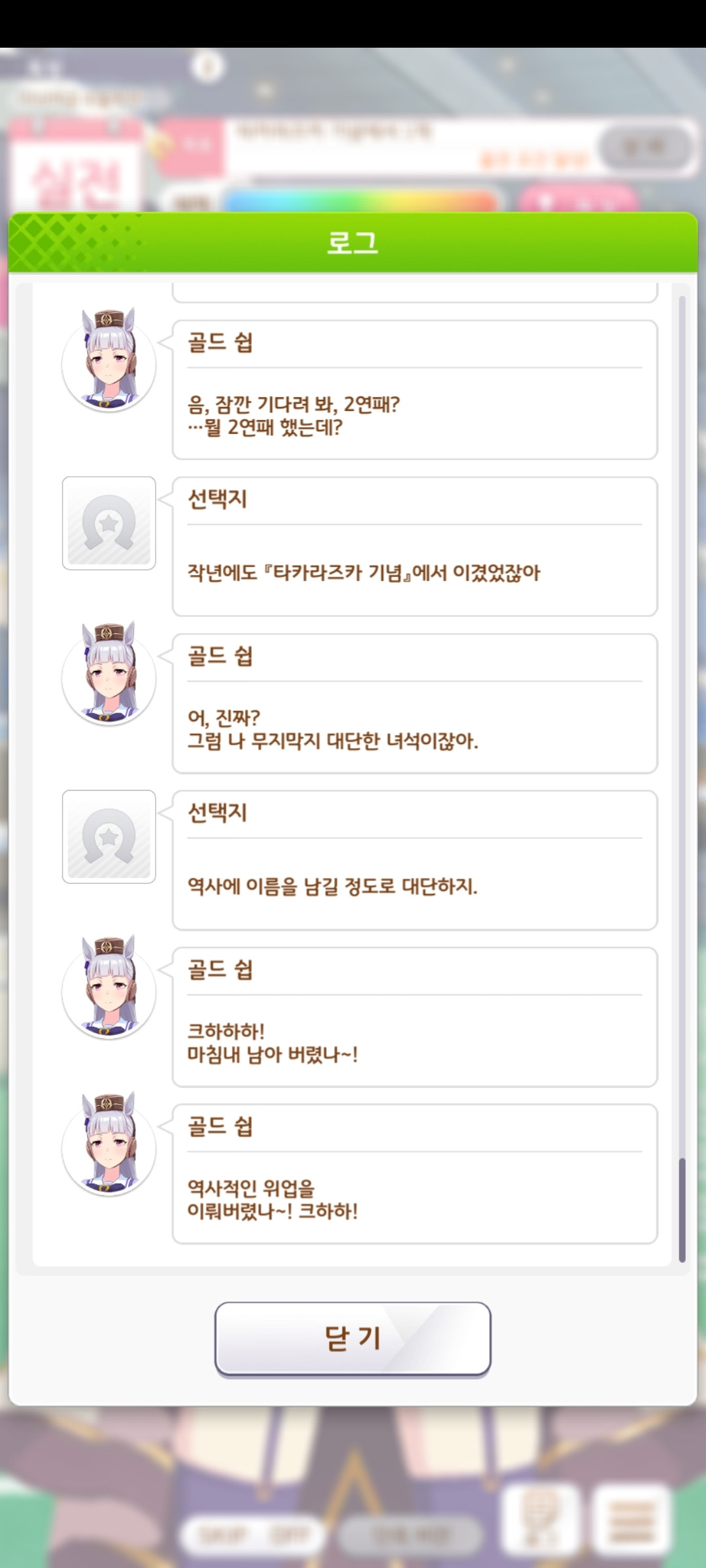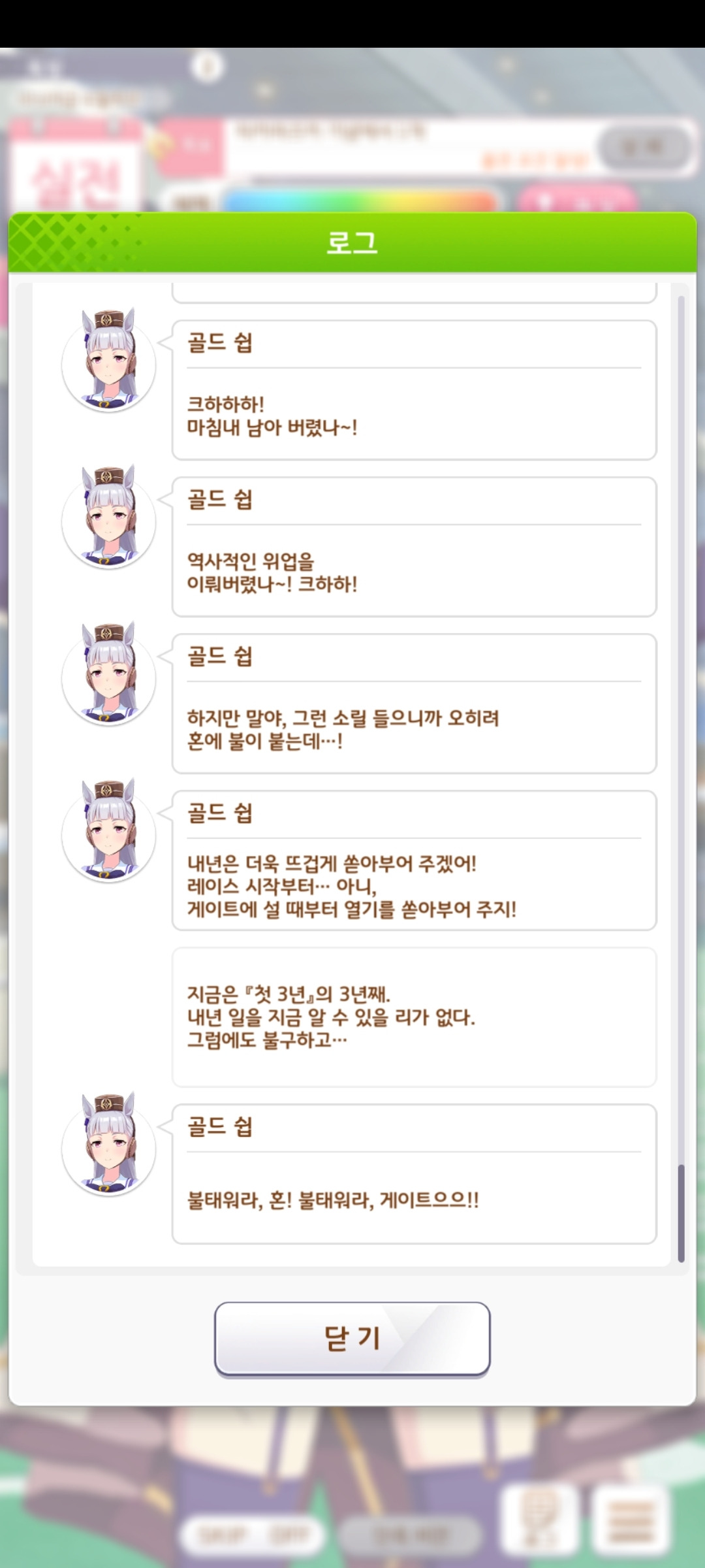 또다른 열정은 시나리오에서 볼 수 있습니다. [우마무스메]에는 메인, 우마무스메, 육성 스토리로 각각 3개 존재합니다. 그중 메인 스토리는 개발사가 주인공을 직접 선별하여 집중적으로 풀어갑니다. 우마무스메 스토리는 각 캐릭터가 트레이너와 만나는 과정과 그 이후를, 육성 스토리는 거기서 레이스를 준비하고 이겨나가는 과정을 담고 있습니다. 그리고 어느 스토리든 대부분은 왕도 스포츠 장르에 가깝습니다. 각자가 가지는 고민이나 관계성은 다르지만 결국 갈등을 해소하고 승리 너머의 무언가를 쟁취하는 건 똑같습니다. 보통 이런 스토리가 많이 나오면 클리셰가 너무 빈번하게 쓰인다고 비판받곤 합니다. 하지만 몰입도 강한 게임에서, 특히 성장하는 과정을 전부 보여주는 육성 시뮬레이션에선 오히려 유저의 집중력을 향상시키는 결과를 가져옵니다. 게다가 스토리를 이끌어가는 주체가 우마무스메이며, 트레이너인 유저는 그녀를 보조하는 역할에 그치는 것도 한몫합니다. 저번에 [드래곤 퀘스트 11 s]를 다룰 때 유저는 주인공의 대사가 적을수록 몰입하기 편하다고 했었습니다. [우마무스메]의 트레이너도 마찬가지이며, 자기만의 감정이나 감상을 표현하기보단 상황을 미사여구 없이 묘사하는 대사가 더 많습니다. 그들이 자기 성격을 확실하게 보여주는 건 우마무스메의 문제를 깊이 고민하고, 트레이닝과 레이스에 매우 강한 열의를 표현할 때 뿐입니다. 거기다 우마무스메를 돋보이게 하는 행동도 가끔 함으로써 유저는 특정 인물에 자신을 대입하여 우마무스메에 몰입하기 쉬워집니다. 육성 스토리 진행 중 우마무스메가 레이스를 끝내면 팬이 늘어나는데, 데뷔전을 치르면 팬이 추가되기 전에 1명이 이미 존재하고 있는 걸 볼 수 있습니다. 그 최초의 팬이 트레이너가 아닐까 싶습니다.