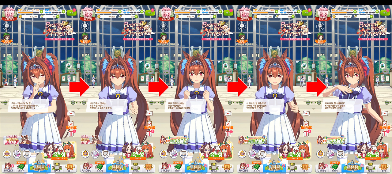 의도가 아닌 이상 개발자가 꼭 막아야 할 순간 중 하나는 유저가 게임을 게임이라고 인식할 때입니다. 버그는 어쩔 수 없다고 해도 카메라 각도나 사운드 매치 등을 꼼꼼하게 따지지 않으면 몰입을 심각하게 방해합니다. [우마무스메]는 레이스 할 때의 연출이나 해설, 캐릭터 더빙 등에 신경을 많이 썼습니다. 특히 게임적 허용으로 넘어가는 것도 열심히 만들었는데, 바로 캐릭터 애니메이션입니다. 다른 게임 대화창을 유저가 직접 넘기는 순간 인물의 움직임을 자세히 보면 기본자세에서 특정 동작을 잠깐 취했다가 다시 돌아올 때가 많습니다. 이는 작업의 효율을 위해서입니다. 특정 자세 1에서 특정 자세 2로, 3이나 4로 넘어가면 연결 동작을 다 따로 만들어야 하므로 작업량이 몇 배로 늘어납니다. 그걸 보통은 기본자세 하나로 퉁치고, 유저도 부자연스럽다고 느끼지 않으면 그냥 넘어가곤 합니다. 하지만 [우마무스메]는 여기서 다른 꼼수를 보여줍니다. 캐릭터의 움직임을 잘 보면, 양팔을 살짝 드는 동작을 특정 자세 사이에 끼워 넣을 때가 많습니다. 이 방식을 취하면 캐릭터의 감정을 더욱 풍부하게 보여줄 수 있습니다. 이건 인물에 생동감을 불어넣으려는 욕심이 있었다는 증거이며, 유저의 몰입을 방해하거나 작업량을 늘리지 않는 게임적 허용이기도 합니다. 거기다 꼬리나 귀, 표정은 이야기 흐름에 따라 다르게 하여 작업량이 늘어나는 걸 개의치 않기도 했습니다. 자연스러운 만큼 티가 잘 나지 않는 부분이지만, 그만큼 그들이 게임에 열의를 가지고 개발했다는 게 느껴기도 했습니다.