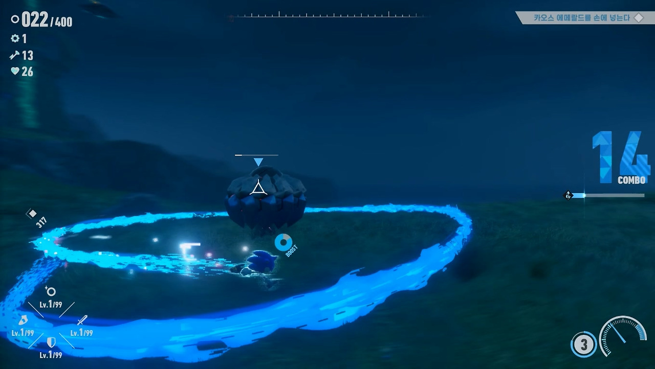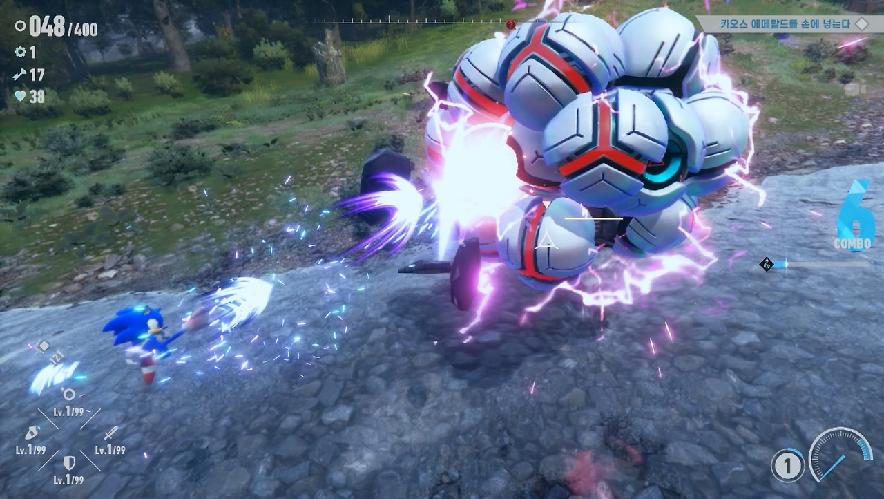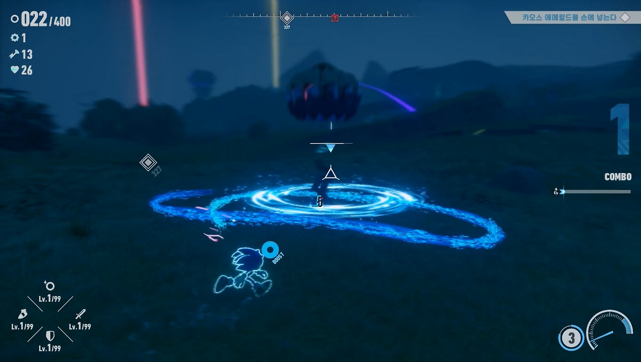 [소닉 시리즈]는 퍼즐 중심의 액션 게임이기 때문에 적과 조우하면 점프로 직접 부딪히거나 호밍 어택, 부스터로 들이박는 등 단순한 공격 방식을 취했습니다. 그러나 [프론티어]에서는 부스터로 달릴 때 적과 부딪히면 주인공이 피해를 보게 변경되었습니다. 개인적으로는 이제 무식하게 달려들기보단 공략을 찾아내라는 개발진의 메시지로 보입니다. 실제로도 적과 교전하는 시간도 대폭 늘어났고, 수호신이라는 필드 보스도 추가되었습니다.