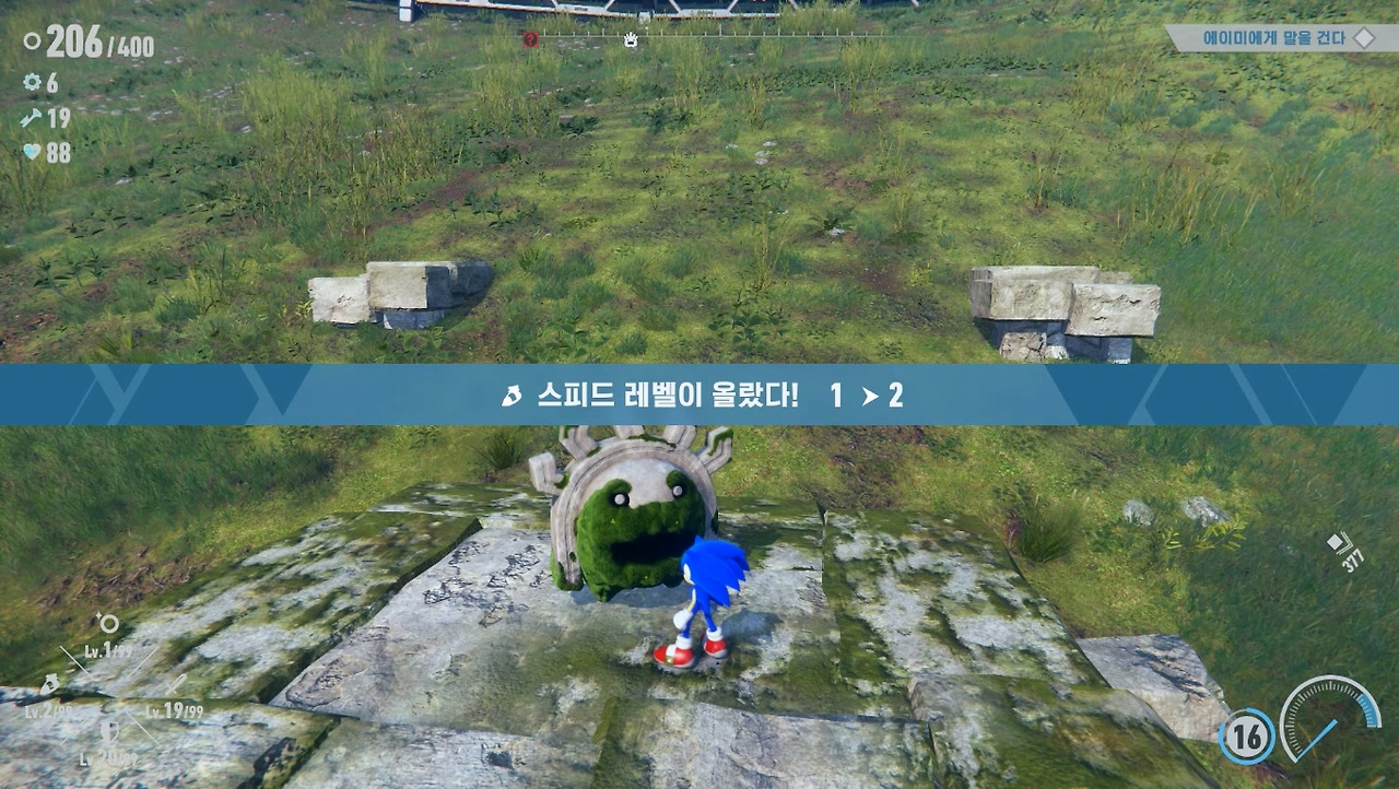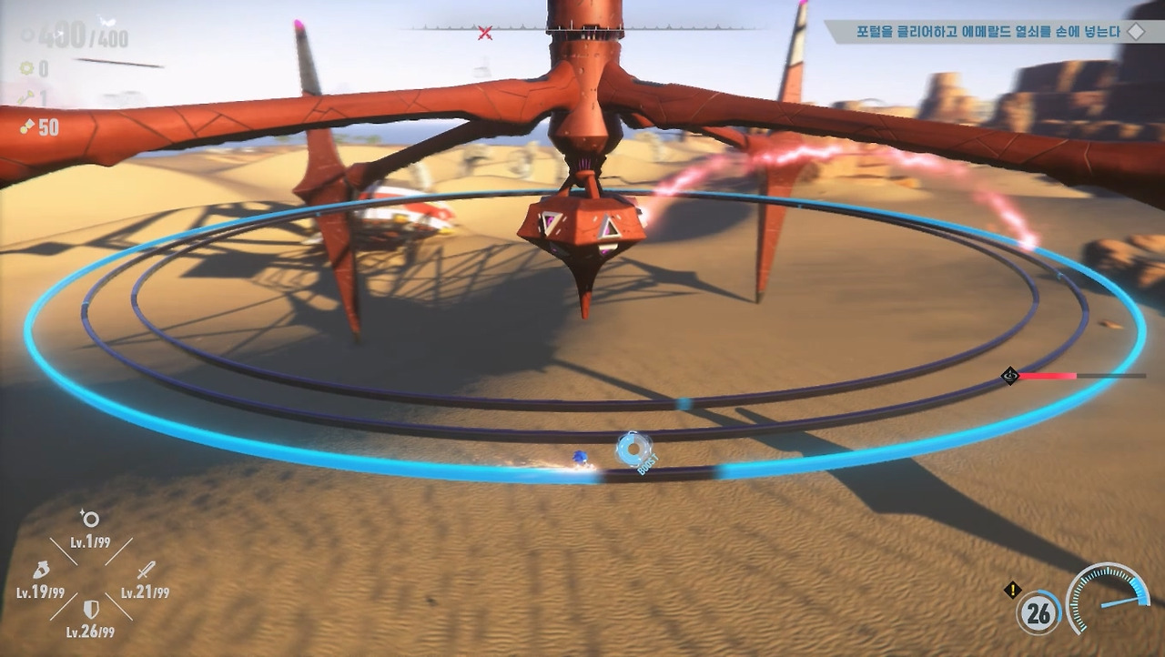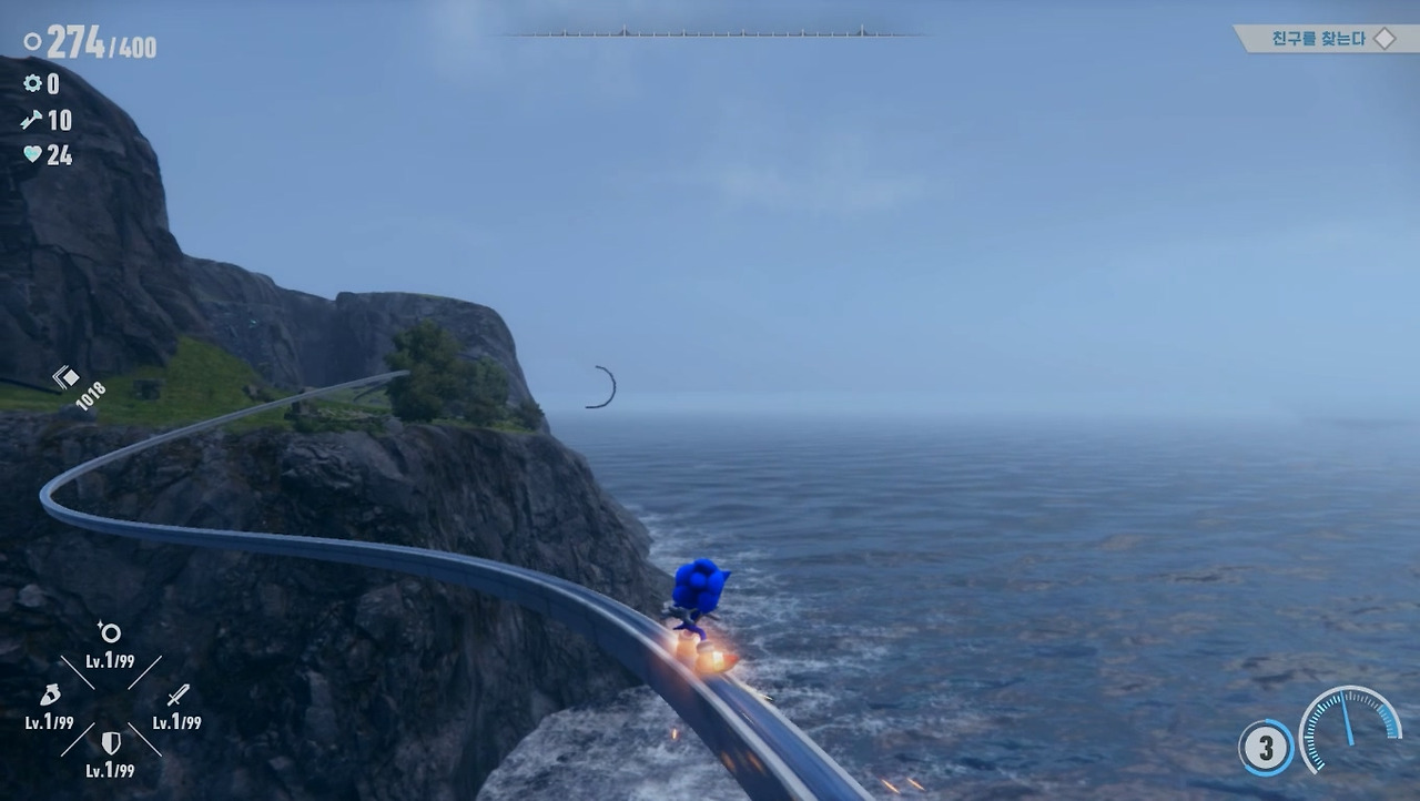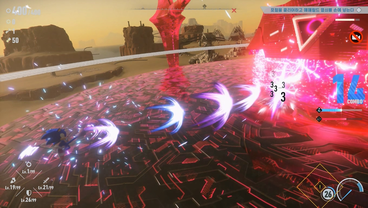 [소닉 시리즈]는 퍼즐 중심의 액션 게임이기 때문에 적과 조우하면 점프로 직접 부딪히거나 호밍 어택, 부스터로 들이박는 등 단순한 공격 방식을 취했습니다. 그러나 [프론티어]에서는 부스터로 달릴 때 적과 부딪히면 주인공이 피해를 보게 변경되었습니다. 개인적으로는 이제 무식하게 달려들기보단 공략을 찾아내라는 개발진의 메시지로 보입니다. 실제로도 적과 교전하는 시간도 대폭 늘어났고, 수호신이라는 필드 보스도 추가되었습니다.