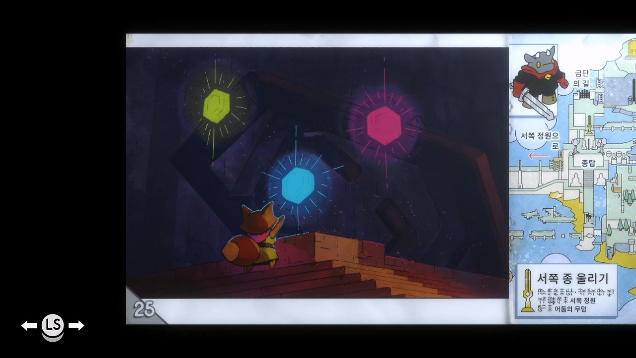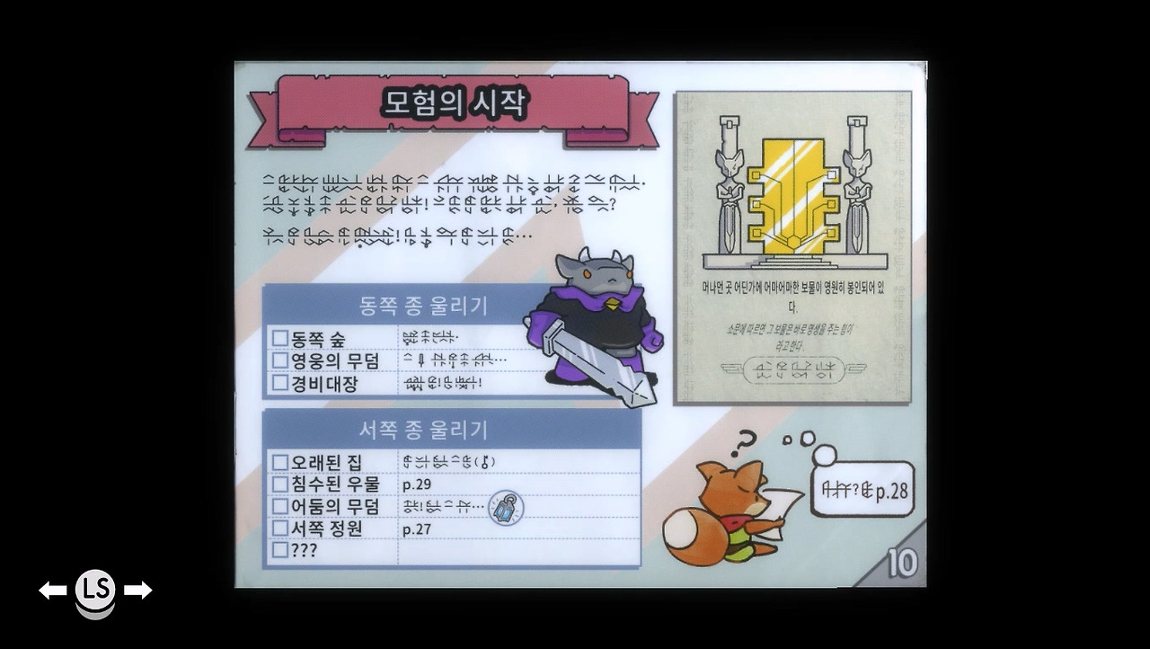 그러나 막상 다시 해보면 옛날 느낌이 잘 안 납니다. 어려웠던 보스들은 너무 쉬워졌고, 이미 지나간 길에서 모험심이 느껴지지 않았습니다. 고전 게임을 모티브로 만든 [메신저]도 옛날 경험 자체를 다시 일으키기는 힘들었습니다. 그 느낌을 전달하는 데 성공한 작품이 바로 [튜닉]입니다. 사실 정확히는 게임 패키지에 두꺼운 매뉴얼을 끼워주던 시절이라 필자가 공감하기 힘든 시절이긴 합니다. 개인적으로 그나마 매뉴얼 비슷한 걸 받은 적도 [젤다의 전설 야생의 숨결] 초회한정판으로 받았던 가이드북과 지도 정도가 다입니다. 어쨌든 고전 게임 자체가 아니라 그때 그 시절의 경험을 주는 건 많은 작품들이 힘들어했던 영역입니다. 이번엔 [튜닉]이 그걸 어떻게 전달했는지 알아보고자 합니다.