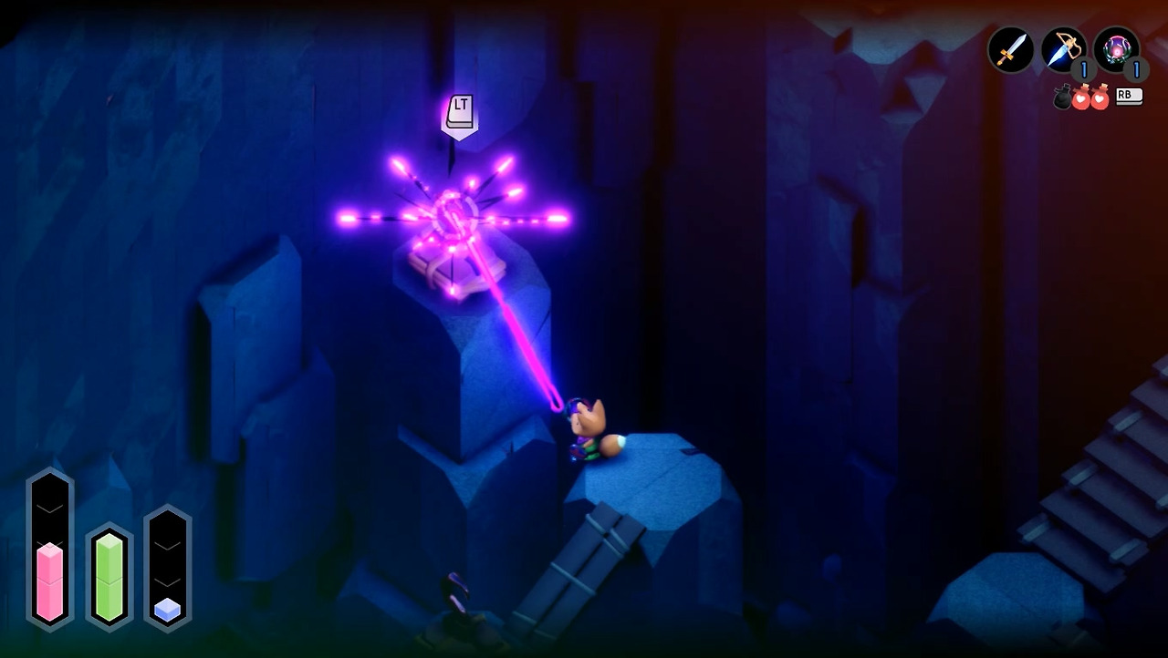 갈고리는 잠시 넘어가고, 이후 몇몇 적의 혀에 끌려가는 경험도 하면서 [튜닉]에 이런 기능이 있다는 걸 알게 됩니다. 개구리 영역 깊숙한 곳까지 도달하여 마법 구체를 획득하면 바로 갈고리에도 집중할 수 있게 되고, 아이템을 장착해서 써보면 몬스터와 같은 능력을 구사할 수 있게 됩니다.