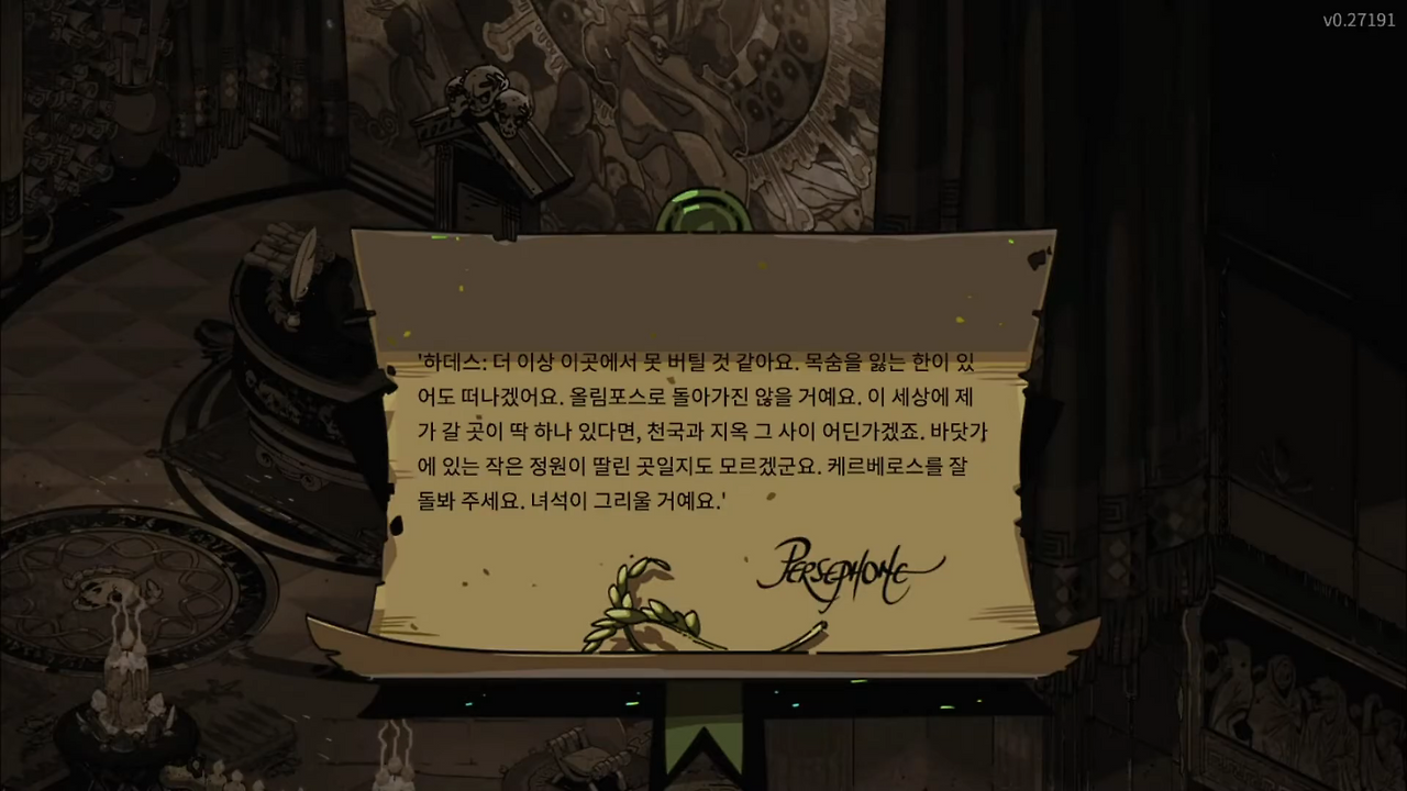 ‘하데스’는 분명 잘 만든 게임입니다. 재화로 또 다른 재화를 구매할 수 있게 하여 수급처를 늘리고, 전투에서 의외성을 기대하기 힘들지만 그만큼 액션 구성을 파악하기 쉽습니다. 그리고 방대한 대사를 전부 더빙 처리해주는 정성도 느껴집니다. 기대할 수 있는 경험적 가치의 최소치와 최대치를 같이 끌어올린 것이 바로 ‘하데스’입니다. 그래서 필자는 이 게임을 로그라이트를 싫어하는 사람에게 추천하고 싶습니다. 플레이가 꼬여 실패하더라도 조금씩 성장했다는 기쁨을 느끼게 해준 로그라이트는 필자에게 이 게임이 유일했습니다. 그래서 독자 분들에게도 스스로 가지고 있던 장르의 편견을 깨부수고 즐길 수 있는 넓혀주는 경험이 되길 바랍니다. 스토리도 나름 볼만할 겁니다. 스포일러를 피해서 설명해 드리자면, 하데스는 여타 그리스 신과 다르게 생각을 하반신으로 하지 않습니다.