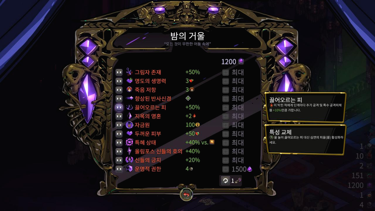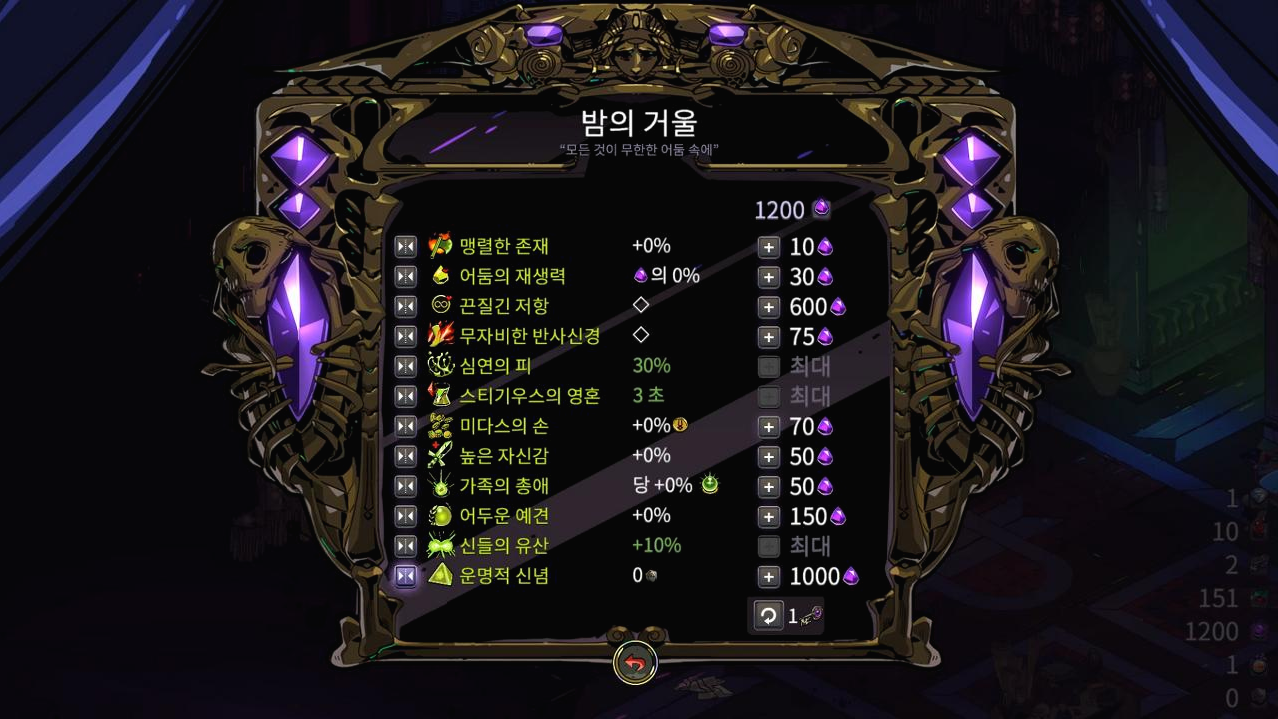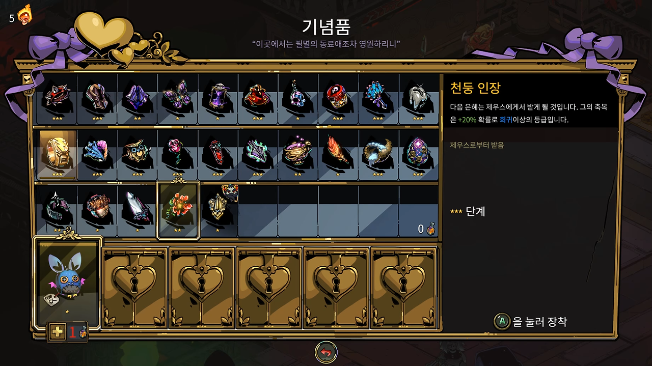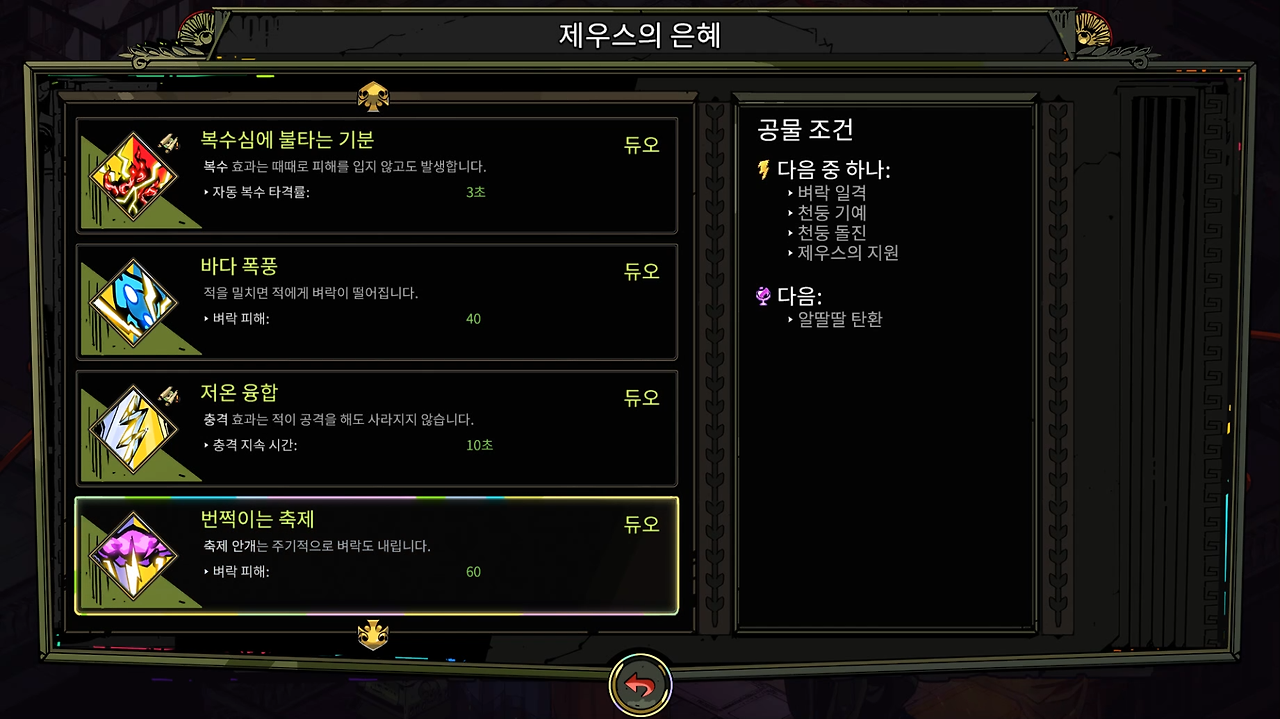 로그라이트 속 던전에서 아이템과 스킬이란 무작위로 얻고 죽을 때 완전히 사라지는 것들입니다. 그래서 그것들은 조합에 따라 막강한 시너지를 보여주기도 하고, 운이 나빠 여정이 힘들어질 수도 있습니다. 하지만 ‘하데스’에는 이런 빌드업을 비교적 쉽게 진행할 수 있도록 되어 있습니다. 이 게임에서 올림포스 신들은 언제 나타날지 모르며, 등장해도 주인공에게 은혜(스킬)을 랜덤하게 줍니다. 이럴 때 원하는 은혜를 얻고 싶으면 해당 신의 기념품을 들고 시작해서 그 신을 첫번째 방에 확정적으로 등장시킬 수 있습니다. 게다가 은혜에는 조건에 따라 순서가 정해져 있어서 상위 은혜를 얻을 확률을 점진적으로 높일 수 있습니다. 설사 운이 없어도 2개 정도 나오는 다이달로스의 망치나 NPC를 통한 강화도 존재하기 때문에 일정 수준으로 강해지는 것도 가능합니다. 그래서 로그라이트 특유의 실험 정신을 자극하고, 어느 정도 원활하게 진행할 수 있도록 도와줍니다.