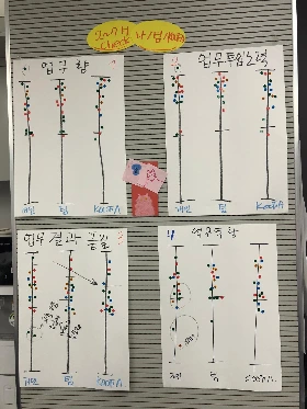 판단하는 습관을 벗어나 서로 탐색을 통해 학습하고, 상황을 개선하거나 보다 새롭고 창의적인 결과를 만들기 위해 우리 조직이 택하는 대화를 시작하는 방식이 "what's the story?"를 묻는 것이다. 우리는 먼저 가장 작은 그룹이 되어 서로의 상반기를 묻고 들었다. 그리고 떠나보낼 것과 취할 것에 대하여 이야기하며 함께 성찰하고, 우리가 구조를 위해 참고할 자료들을 축적해 나갔다. 그리고 이것을 보다 구체적으로 심화하지만, 쉽게하기 위해 현재 경험하고 있는 제도를 돌아볼 수 있는 평가지표 몇가지로 자를 만들어 개인의 의견을 표시하고 그 결과를 가지고 이야기를 시작했다. 암묵적으로 추정하고 있었지만 꺼내지 않았던 이야기와 더불어 시사점에 대하여 조금 더 깊이 서로 묻고 의견을 들었다.