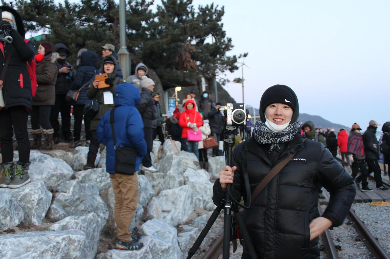고등학교 친구인 유섭, 채진과 함께 넉넉히 필름과 장비를 챙겼다. 우리는 밤 늦게까지 분당 서현역에서 시간을 때우다가 이른 밤에 출발했다. 정동진 푯말이 보이기 시작했을 쯤, 도로 변에 차들이 굉장히 많이 세워져있는 것을 보았다. 도착하기까지 아직 거리가 꽤 있었는데도 여기저기 사람들이 주차해놓고 정동진을 향해 걸어가기 시작했다. 우리는 주차할 공간을 어렵게 찾은 후에 차에서 내려보았다. 날씨가 굉장히 추웠다. 안에 세겹을 입고 겉옷을 입었는데도 굉장히 추워서 유섭이가 빌려준 패딩점퍼를 입었다. 그래도 추웠다. 해 뜰 시간까지 약간 시간이 남아서 잠시 눈을 붙였다.