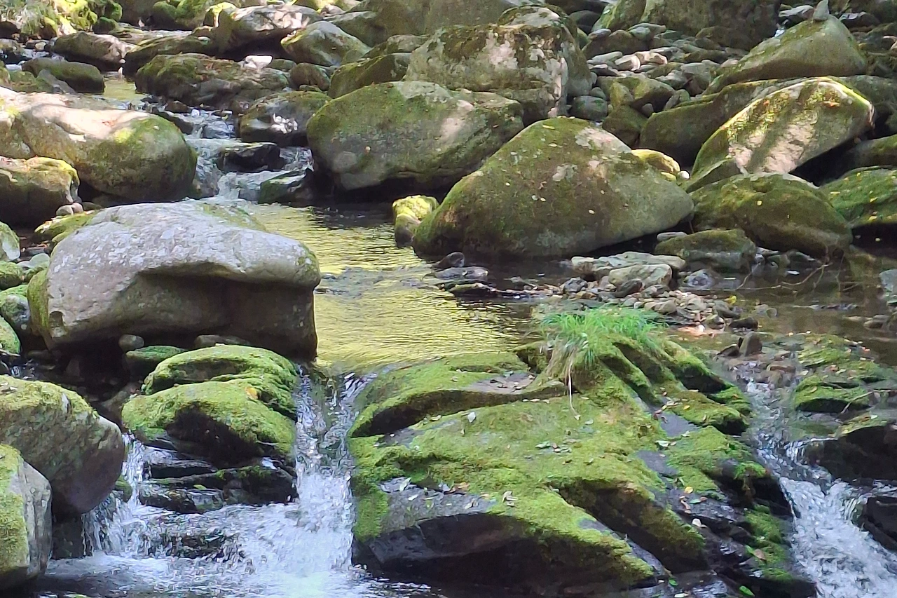 산속 계곡이어서 맑은 물이 쉼 없이 흐르고 바위를 만나면 구부러지고 흐르다가, 커다란 돌을 만나면 거친 속살을 드러내며 허연 거품을 일으킨다. 낙차가 있는 높이에서는 물소리가 웅장해진다. 그리고 반드시 아래엔 깊은 소를 만들어 놓았다. 짙고 검푸른색 물빛과 함께. 여기저기서 탄성이 나온다.