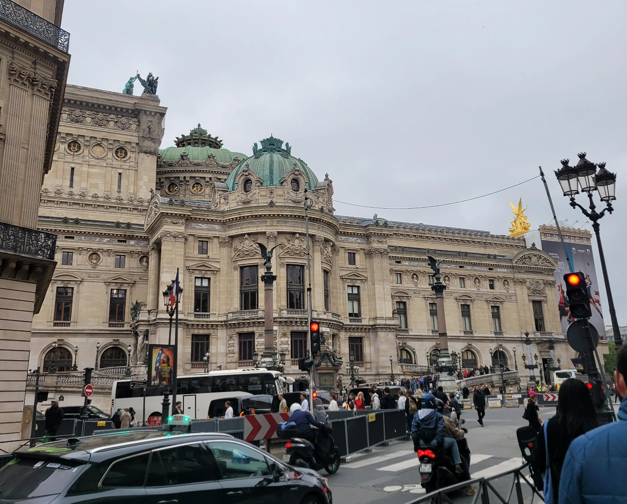 하지만 오페라 역을 향해 걸어가는 길에 생각도 못 한 오페라 가르니에를 마주친 순간, 온 마음이 탄성을 지르며 불안을 날려버렸다. 차와 인파로 북적이는 좁은 도로 옆에 ‘두둥!’하고 시야를 가득 채우며 오페라 가르니에가 나타났다. 한 눈에 담을 수 없을 정도로 화려한 외관과 우아한 옥색 돔, 금방이라도 날아갈 듯 날개를 펼치고 지붕 위에 올라서 있는 황금상. 주변을 압도하는 화려함이었다. 오페라 가르니에 혼자 150년 전의 화려한 파리에 있는 듯했다.