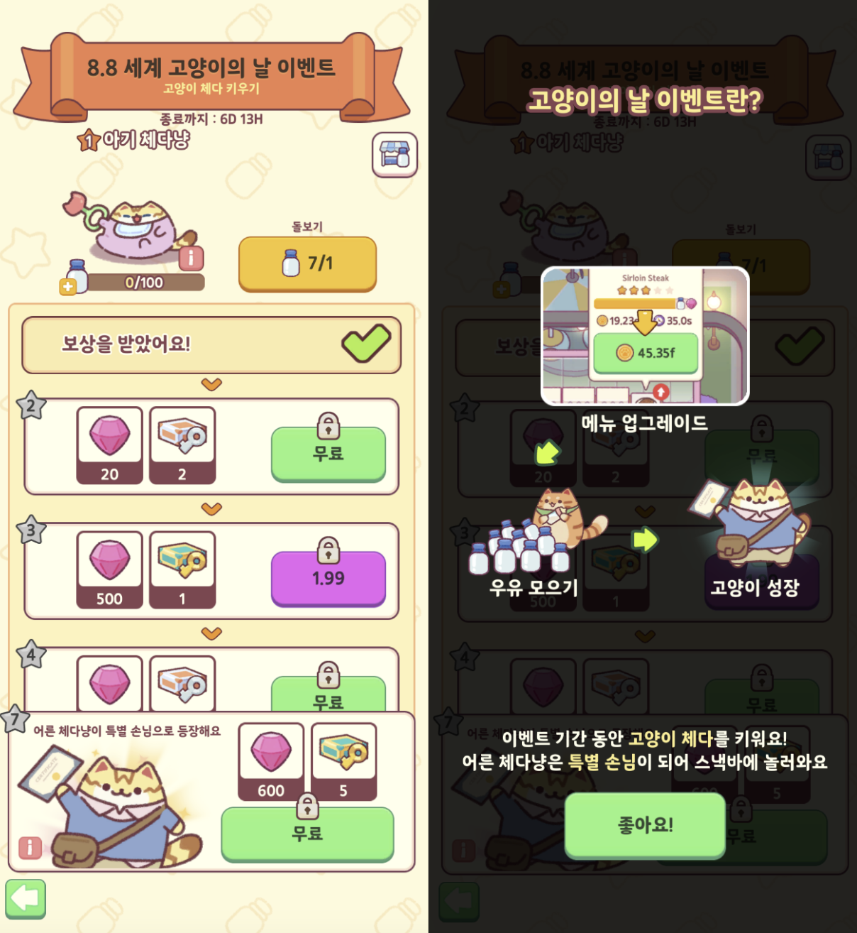 방식은 위와 같다, 고양이스낵바에서 각 작업대의 레벨을 업그레이드하면 특정 구간마다 우유를 획득할 수 있는데 그 우유를 왼쪽 이미지의 아기고양이에게 먹이면 게이지가 가득 찰 때마다 레벨이 오른다.