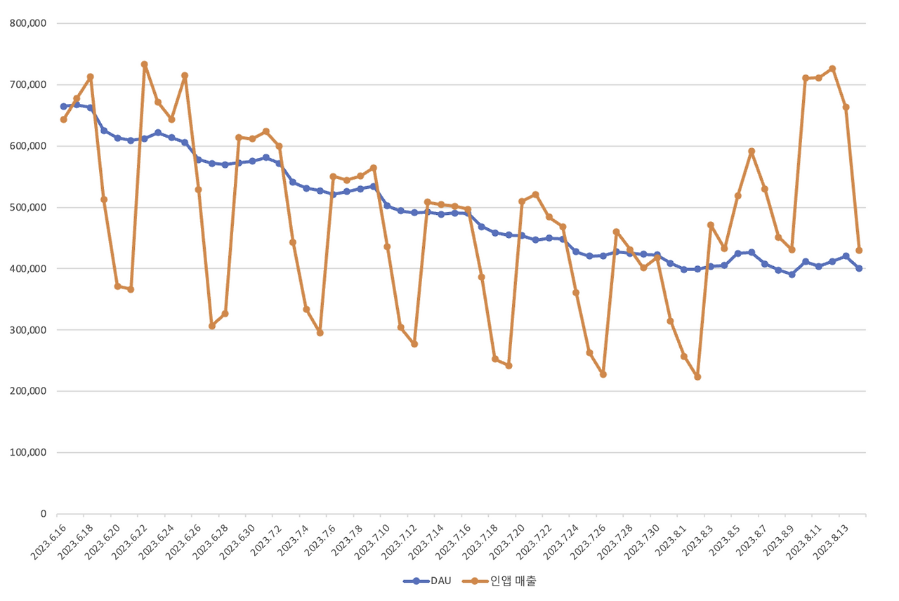 거두절미하고 인앱매출 그래프부터 설명해 보겠다. 파란색 선은 6월부터 현재까지의 DAU를 의미한다. 최근을 기준으로 약 40만 정도의 수준을 유지 중이며, 위 그래프의 6월에 비하면 약 30만 정도 줄어든 상태라고 보면 된다.