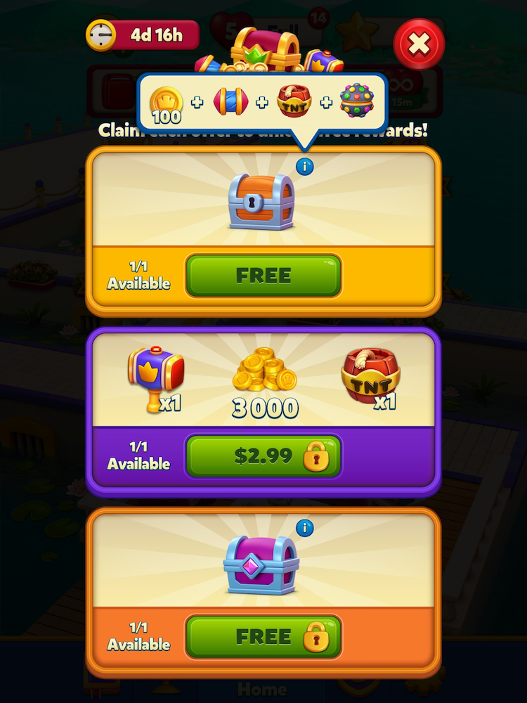 방식은 이렇다. 왼쪽 이미지를 기준으로 이야기를 해보자면, 각각 2레벨, 4레벨에 무료 보상이 있다. 3레벨의 보상은 $1.99를 지불해야 획득할 수 있는 인앱 상품이다.