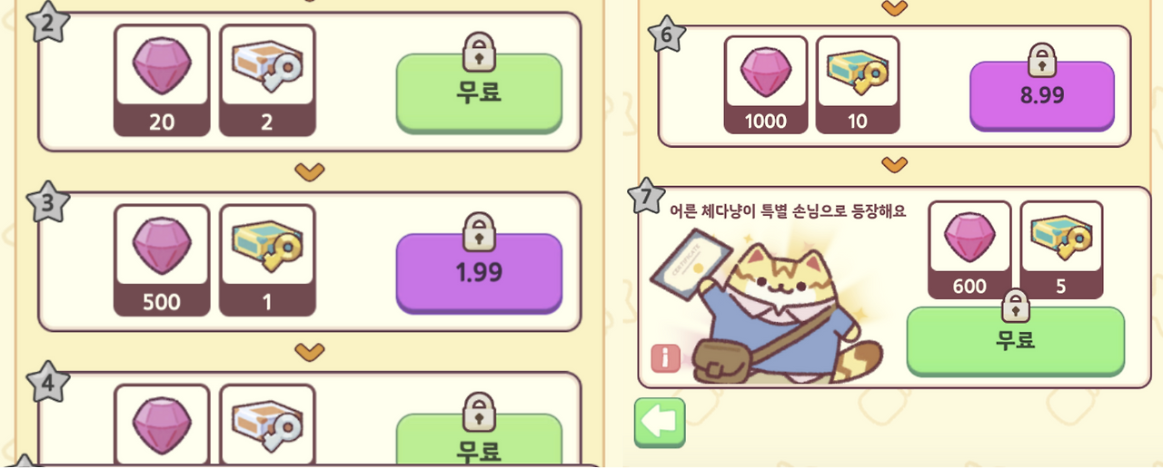이때까지 고양이스낵바를 업데이트해가며 다른 게임들을 참고해 보면서 유저에게 가장 매력 있게 다가오는 상품은 유저 플레이와 인앱상품을 밀접하게 접목하는 상품이라는 것을 어렴풋이 깨달았다. 쉽게 이야기하면, 거의 모든 게임에 존재하는 패스상품도 이에 속한다.
