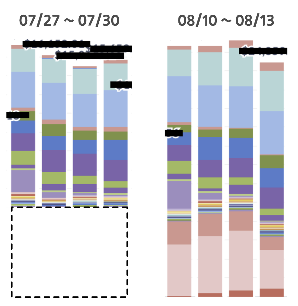 위 이미지는 우리 게임의 주 매출 기간인, 목금토일 매출 그래프이다. 왼쪽은 고양이의 날 상품이 들어가기 전이고, 오른쪽은 고양이의 날 상품이 들어간 후이다.