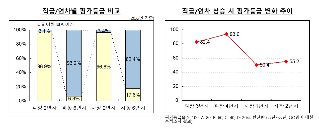 좀 오래된 컨설팅 자료이긴 하지만, 재미있는 평가등급 분석 자료를 보여주겠다. 실제 필자가 15년 전쯤 수행했던 국내 굴지의 기업 인사제도 진단 결과 중 평가등급 변화 추이 관련 내용이다.