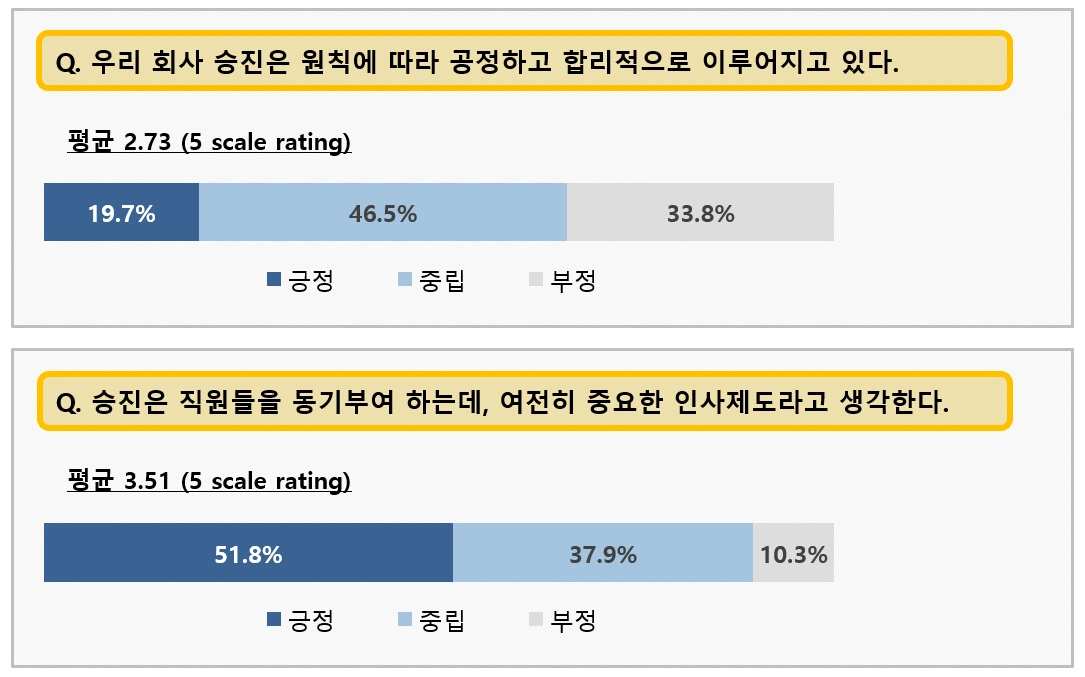 필자의 회사가 수행한 프로젝트의 EOS Database에서 '승진'영역의 주요 질문 문항 결과를 살펴보니, 직장인들은 승진이 여전히 중요한 동기부여의 수단이라고 생각하고 있지만, 운영되고 있는 승진제도가 공정하고 합리적으로는 운영되지 못하고 있다는 인식의 결과를 보여주고 있다.
