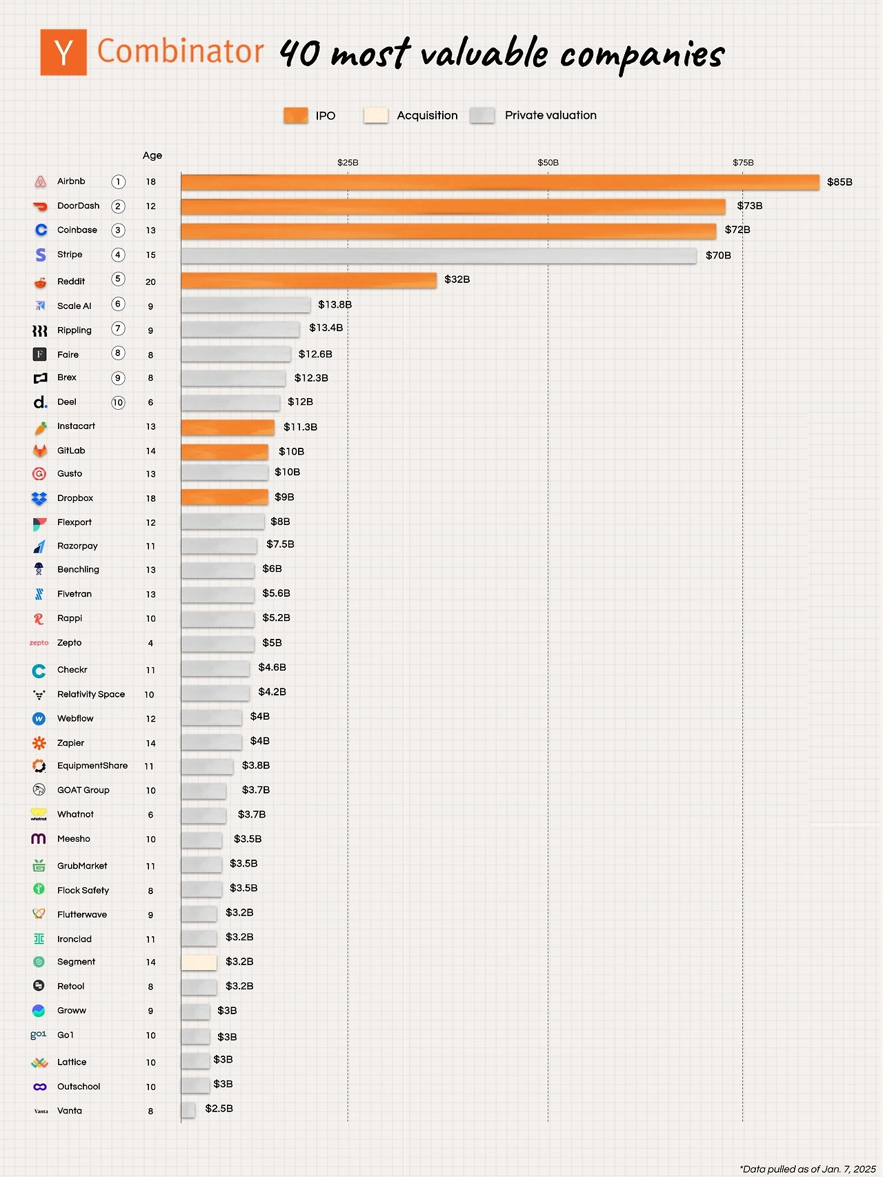 지금까지 YC는 10억 달러(1조 이상) 이상 가치가 있는 90개 기업에 투자를 해왔으며, YC의 대표적인 기업으로는 Stripe, Airbnb, Coinbase, Reddit이 있다.