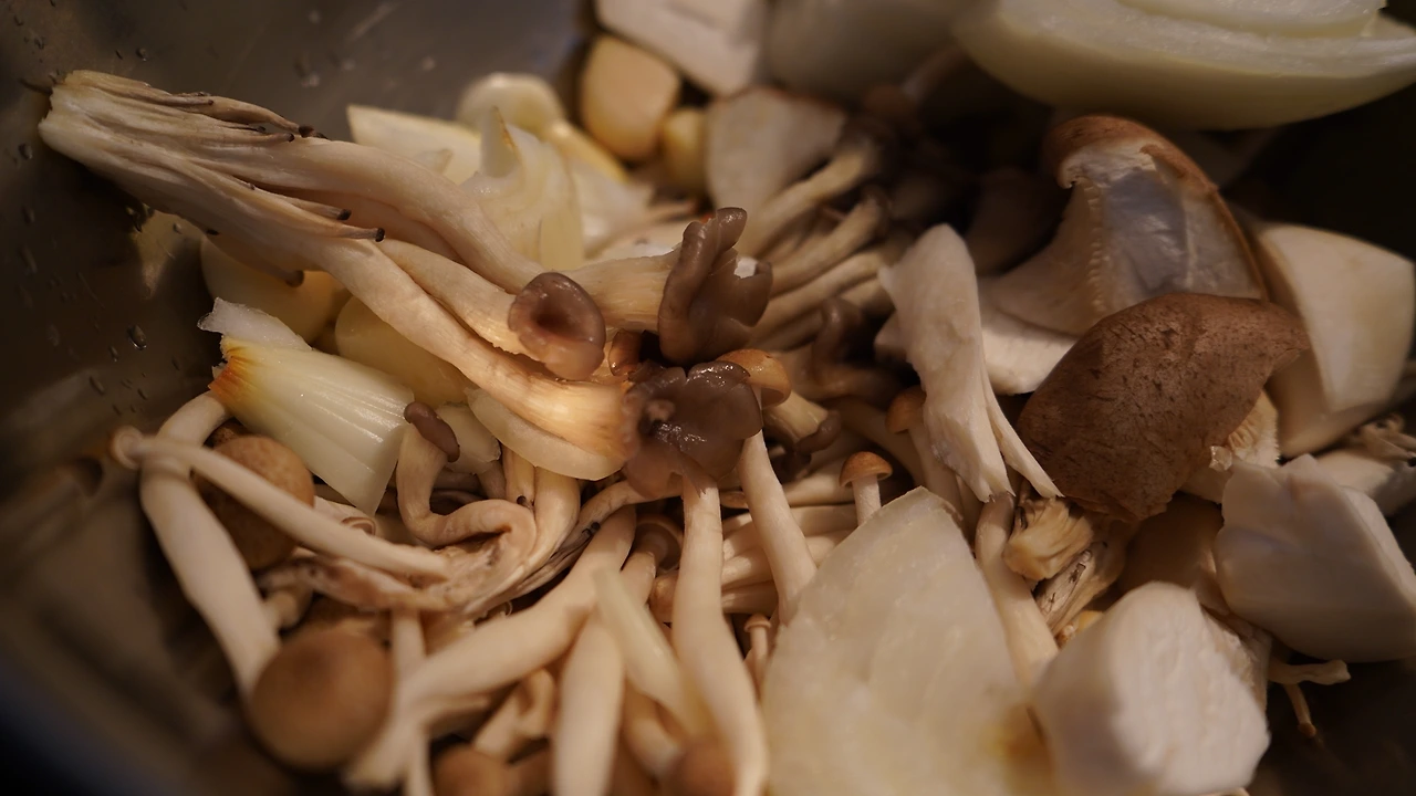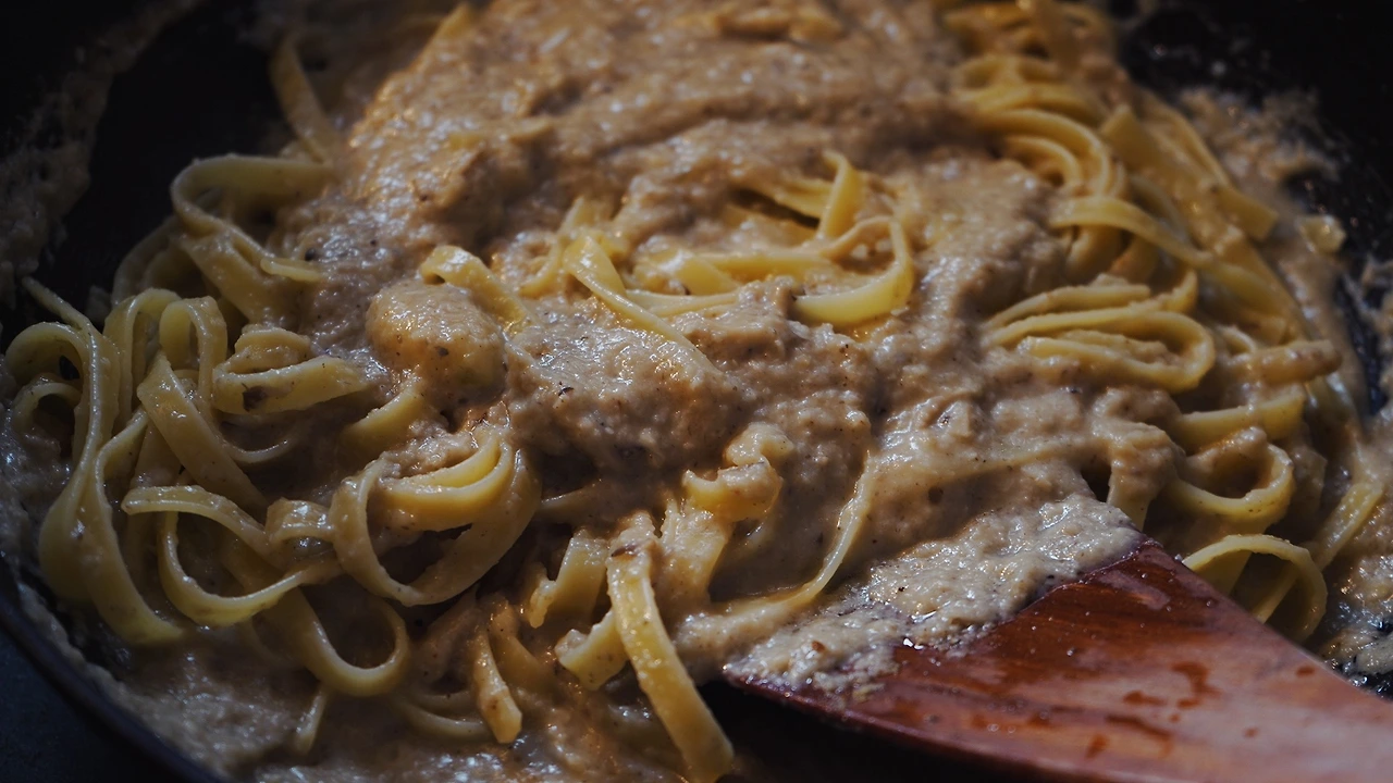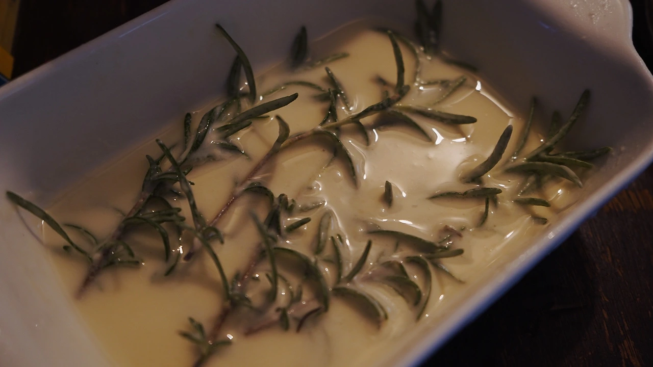 버섯, 양파, 마늘을 믹서에 갈아 올리브유를 두른 팬에 강불로 수분을 날리며 볶고, 무가당 두유와 연두를 넣어 만든 버섯 크림 파스타. 되직한 감이 있어 꾸덕한 크림 파스타로 기능을 충분히 했다. 로즈마리는 왜 튀겨 먹지 않을까 하며 만들어 보았는데 예쁘긴 하나 다들 안 튀겨 먹는 이유가 있었다.